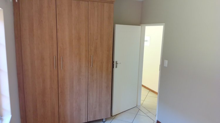 The bedrooms are generously sized with massive cupboards, perfect for storage. The walls are painted in a chic grey tone, adding a modern touch to the space.