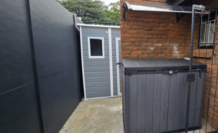 Outside, a Wendy house for extra storage and undercover parking for one car.