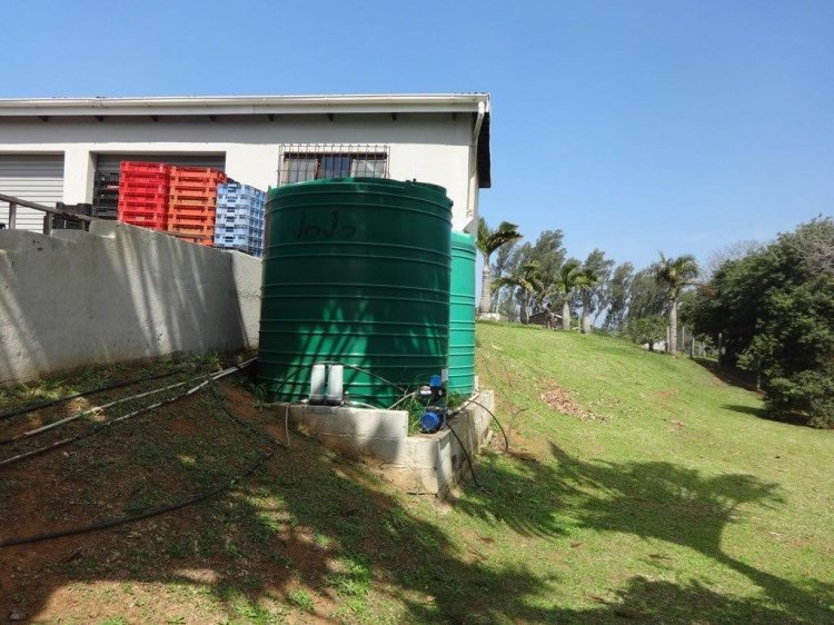The smallholding has a three phase Eskom supply. The rainwater is harvested and stored in two x 5000 litre tanks and plumbed into the house.
