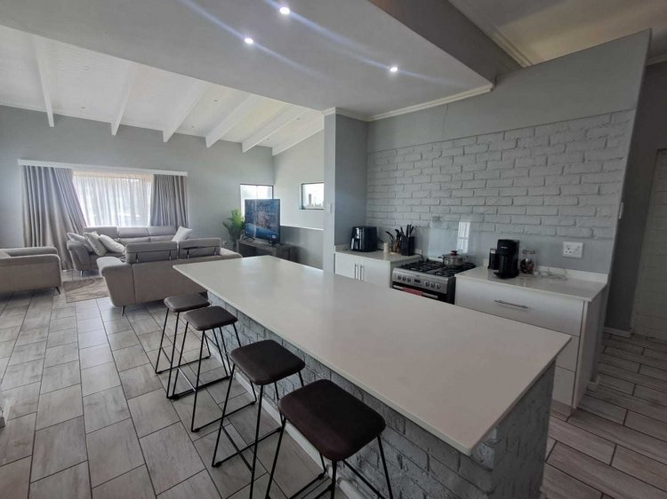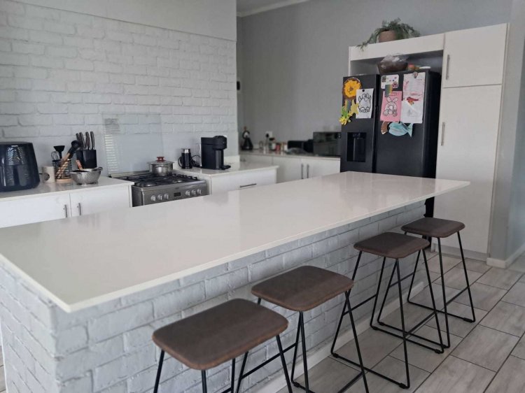 As you enter the front door, a short flight of stairs leads you to a bright and spacious open-plan living area, designed for both relaxation and entertaining. The kitchen features a large centre island with elegant quartz countertops, a gas stove, and a separate scullery for added convenience.