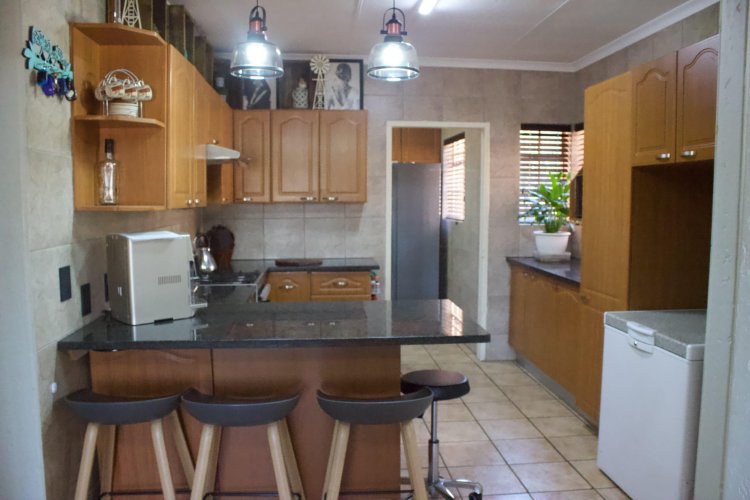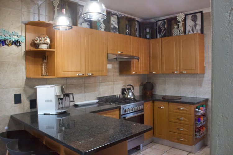 The home welcomes you with an open-plan kitchen that flows seamlessly into the lounge area, creating a bright and inviting living space. The kitchen is well-appointed with granite countertops, a gas stove top, ample cupboard space, and a separate scullery, providing both functionality and style.