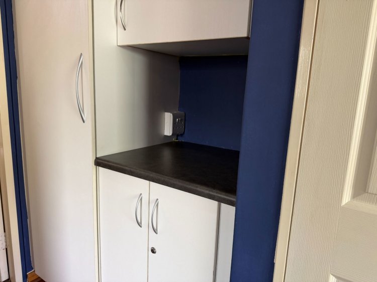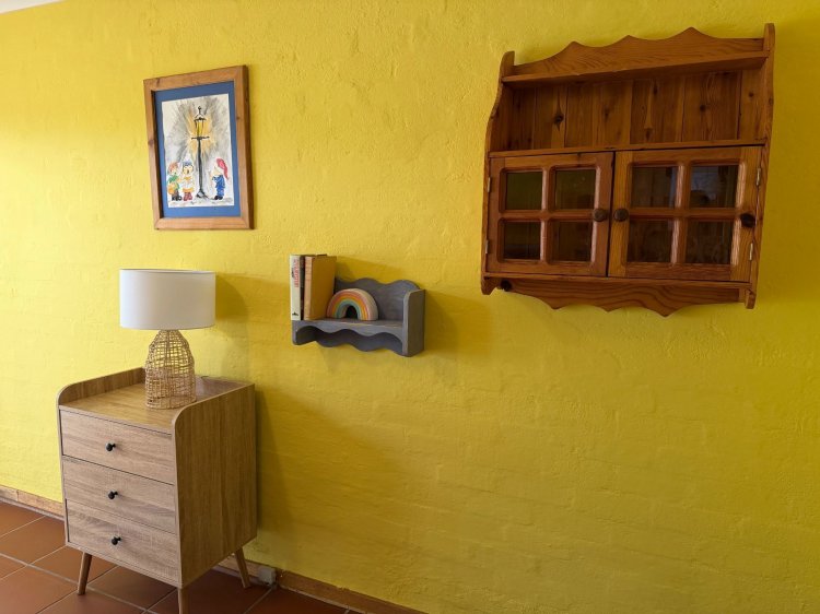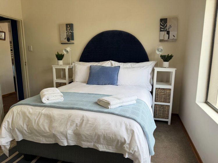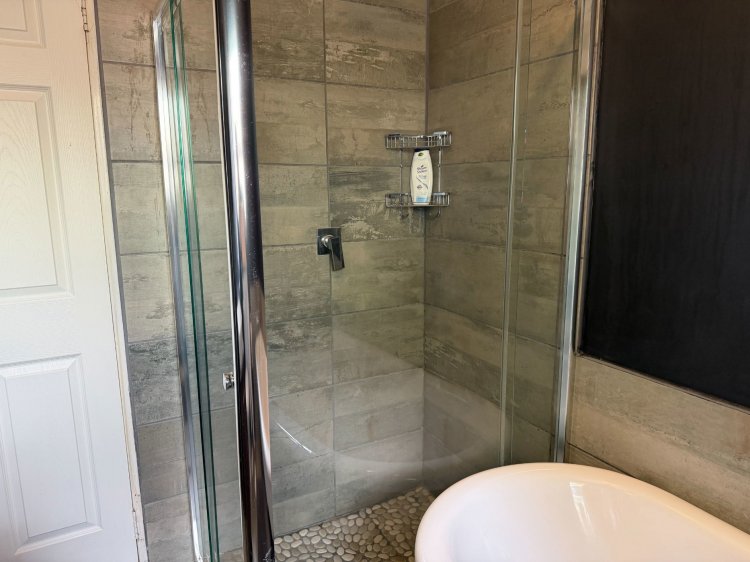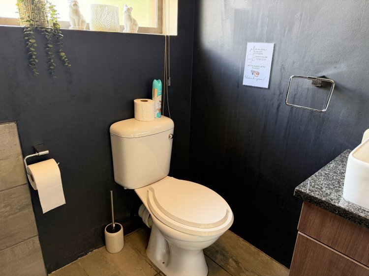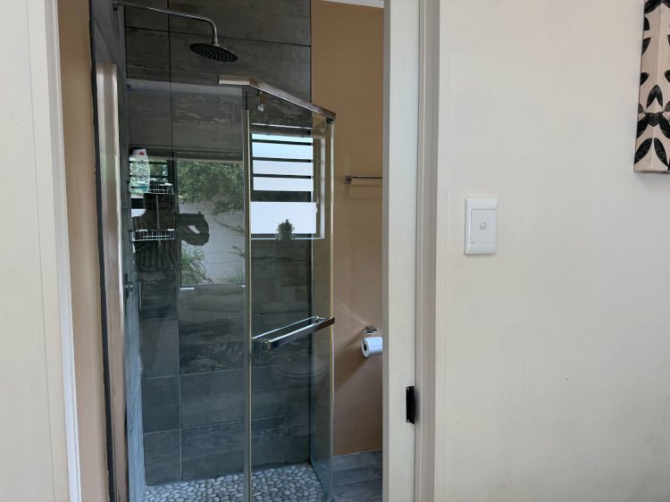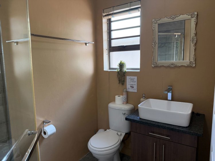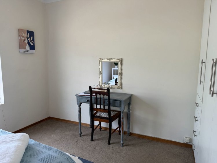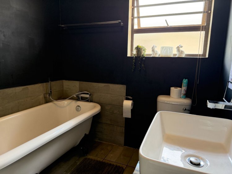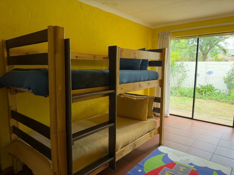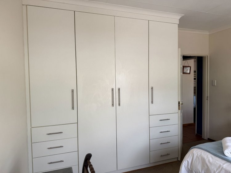 The main bedroom offers built-in cupboards and a private en-suite bathroom with a shower and toilet. The second bedroom enjoys good natural light and also features built-in cupboards. The third bedroom has tiled floors and a sliding door that opens onto the garden, creating a flexible space that works well as a guest room, office, or hobby room. One side of this room has been neatly adapted into a small laundry area. A second bathroom, shared by the additional bedrooms, includes a bath, shower, and toilet.