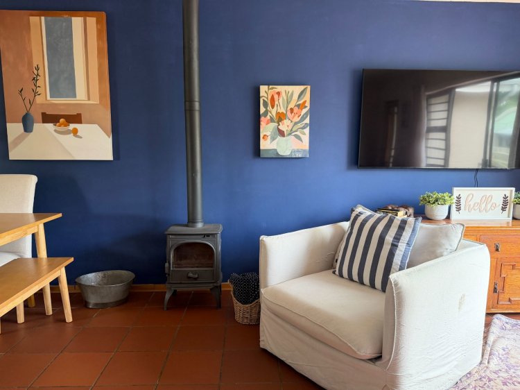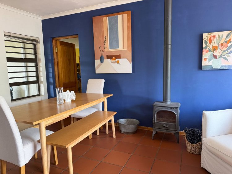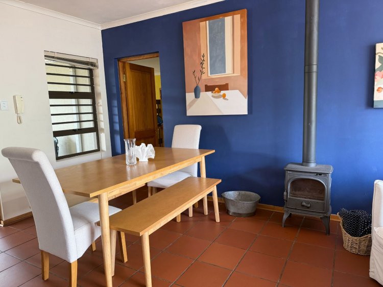 Inside, the home opens into a spacious open-plan kitchen, dining, and living area. The layout feels comfortable and practical, with a combustion fireplace that creates a warm and inviting space during cold Clarens evenings. The kitchen is well sized for the unit and designed to flow naturally into the living areas, making it easy to entertain or enjoy relaxed everyday living.