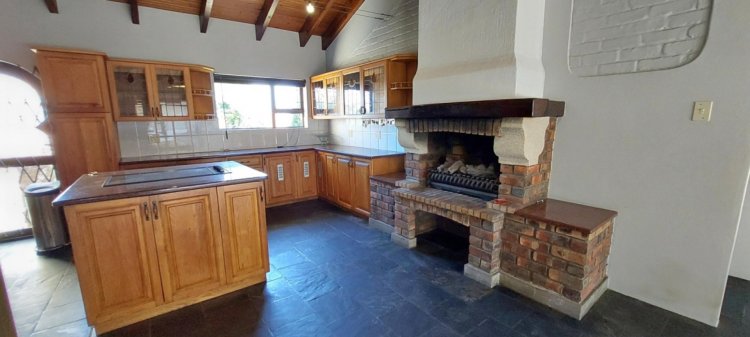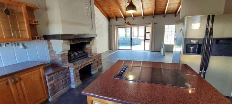 Downstairs offers a relaxed lounge with a built-in bar, seamlessly flowing to the central swimming pool, undercover entertainment area, and built-in braai—ideal for entertaining. The open-plan kitchen and dining area, complete with its own fireplace, forms the warm and inviting heart of the home, with sliding doors leading directly to the pool area.
