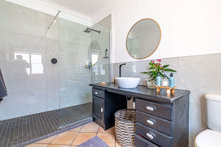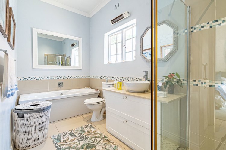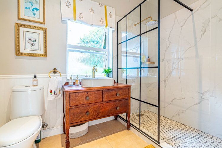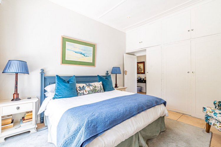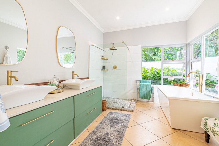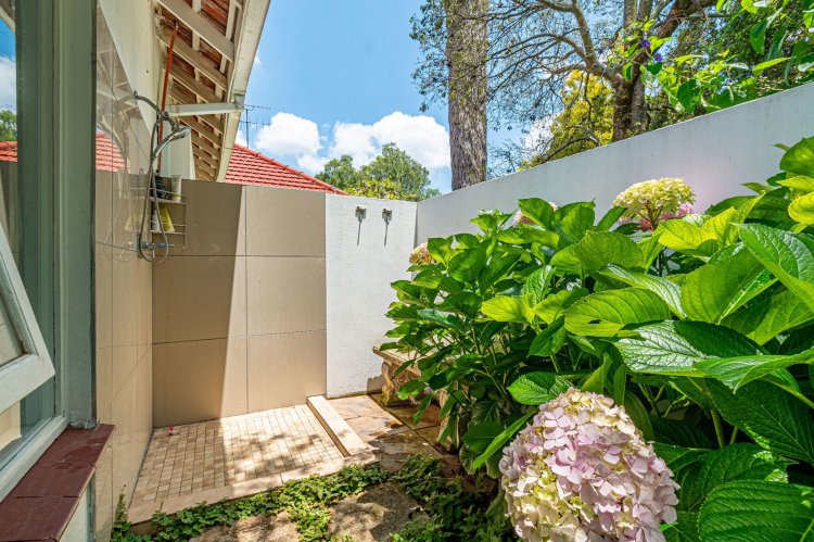 The home offers four well-appointed bedrooms. The main suite boasts a large en-suite bathroom, dressing area and workspace, with French doors leading to an outdoor shower in a private enclosed courtyard. The en-suite is beautifully finished, filled with natural light from large north-facing windows and overlooking the tranquil courtyard.