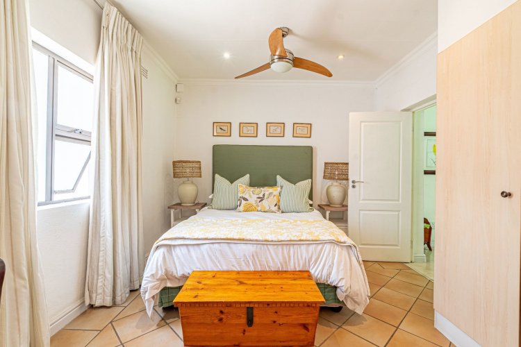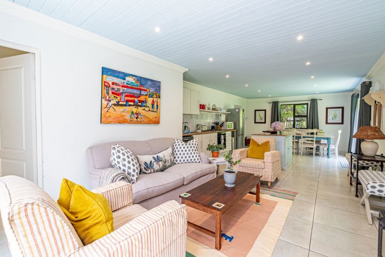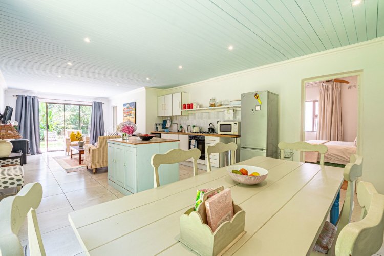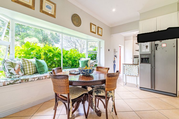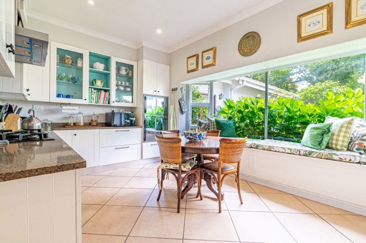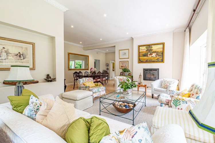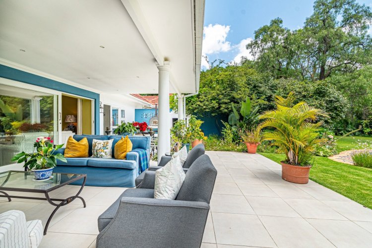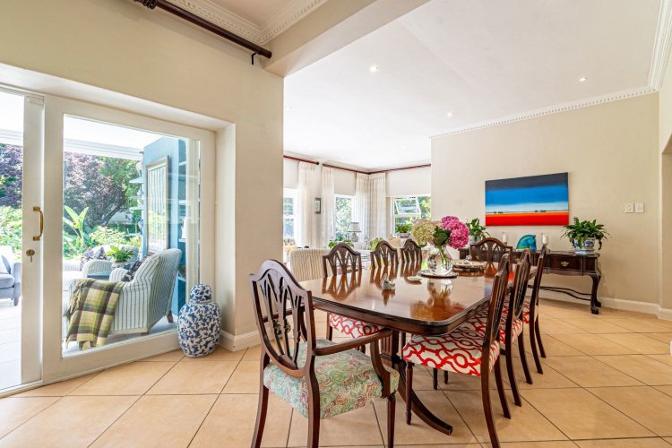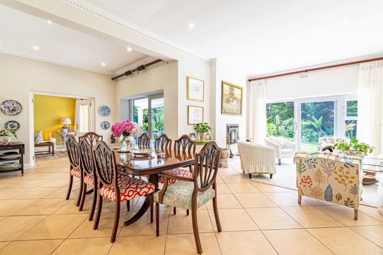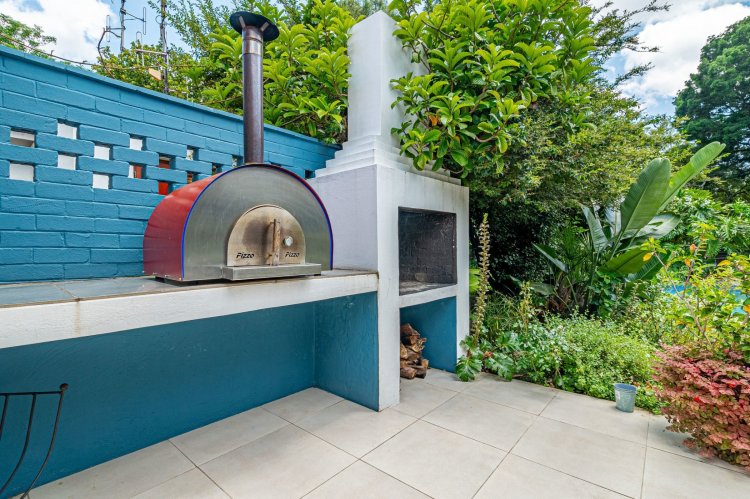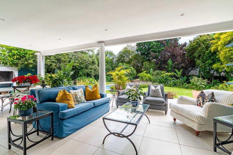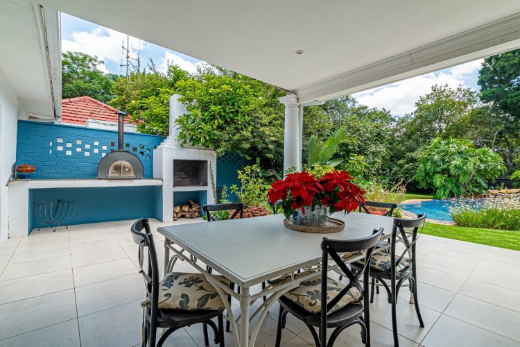 A welcoming entrance hall with an atrium sets the tone and flows seamlessly into spacious, open-plan living areas. The bright living room features a built-in fireplace and connects to the dining area and a family room with French doors that can be closed for privacy. All living spaces open onto a large covered verandah, complete with a built-in braai and a freestanding pizza oven, overlooking the lush garden and swimming pool — ideal for relaxed entertaining.