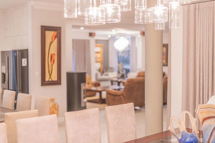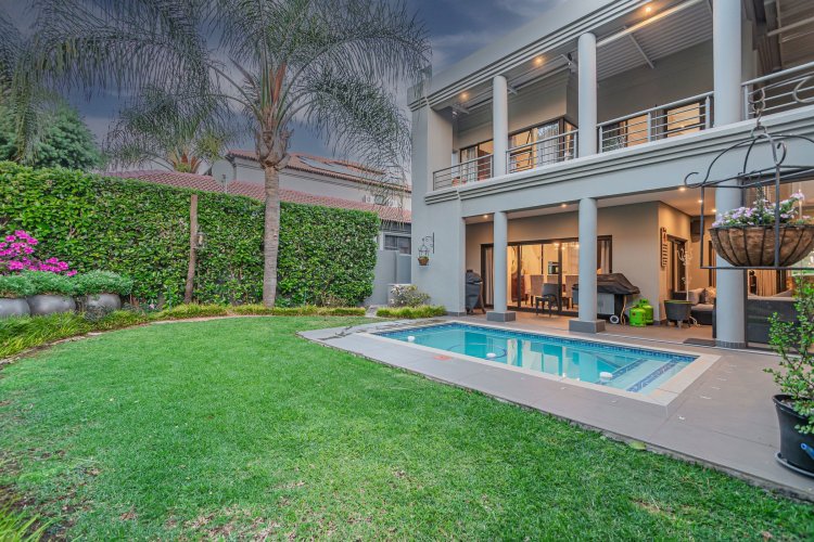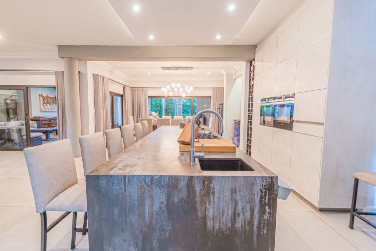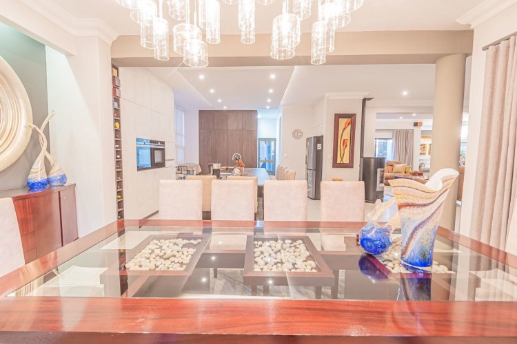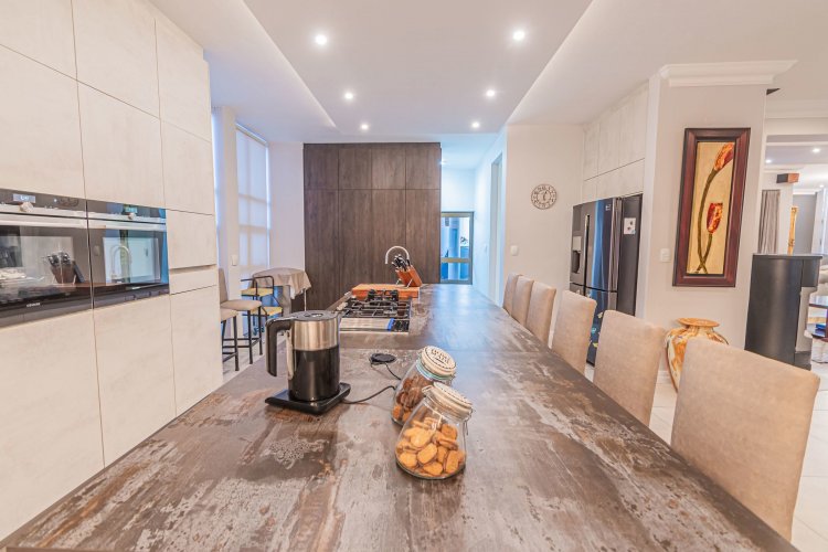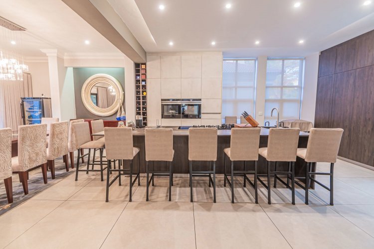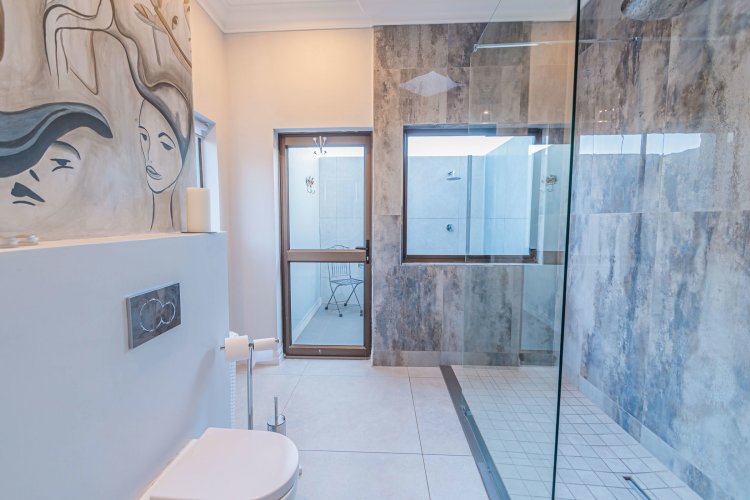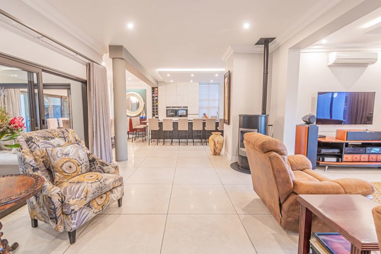 The moment you enter the house you are surrounded by luxury. A dream staircase, double volume entrance, open-plan living, a braai-stoep area with sliding doors and a wood burner in the living area with an adjacent dining room with the finest finishes, opening up to the stoep-braai patio overlooking the pool and garden.