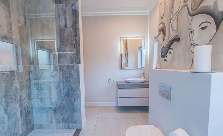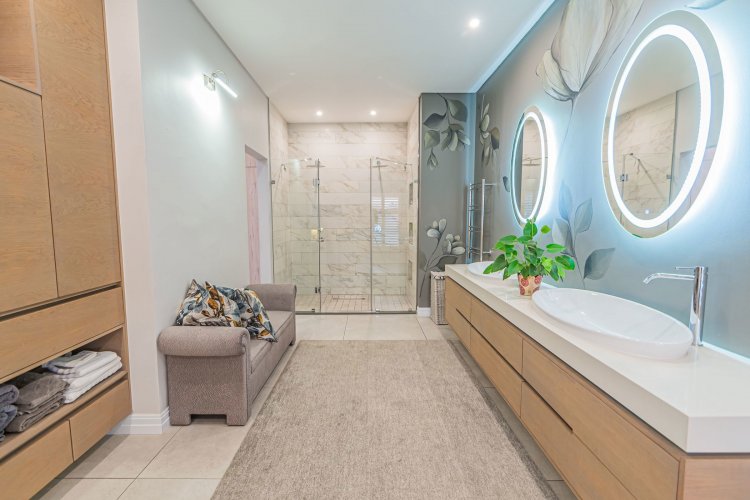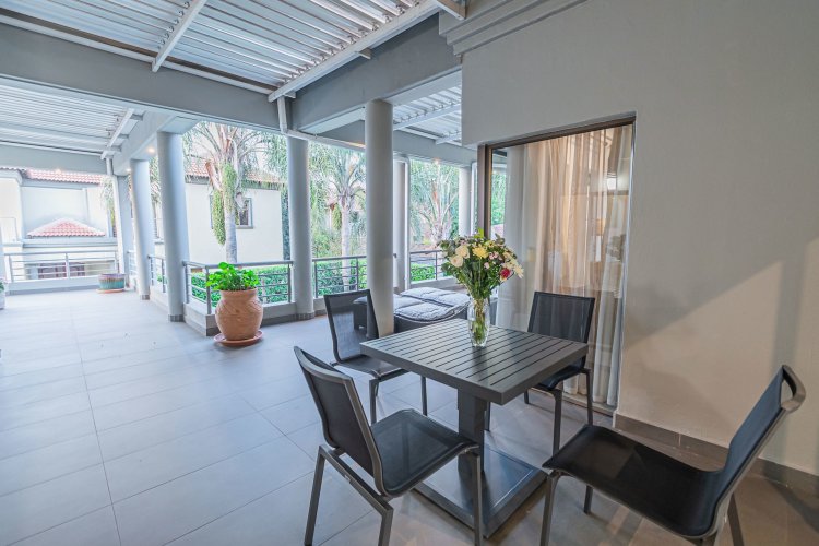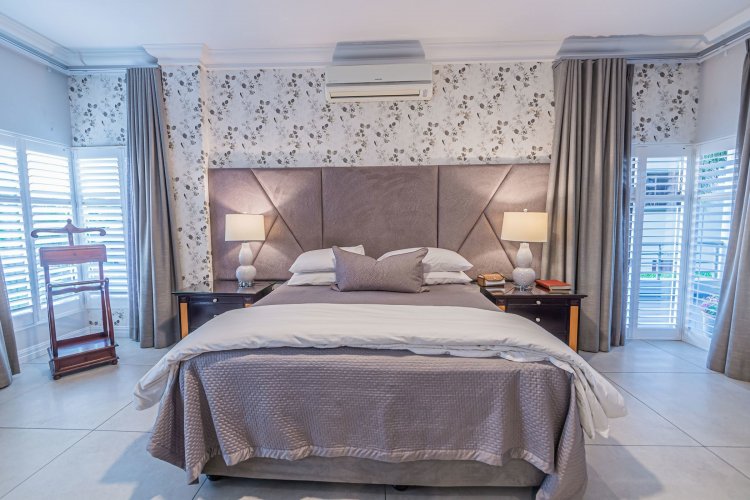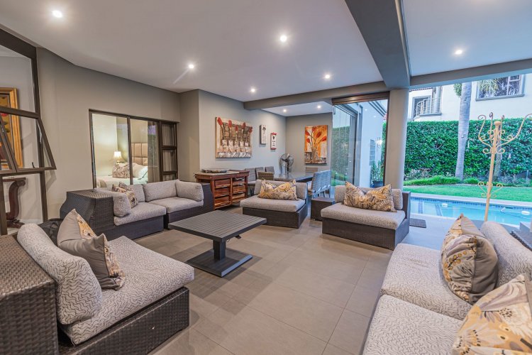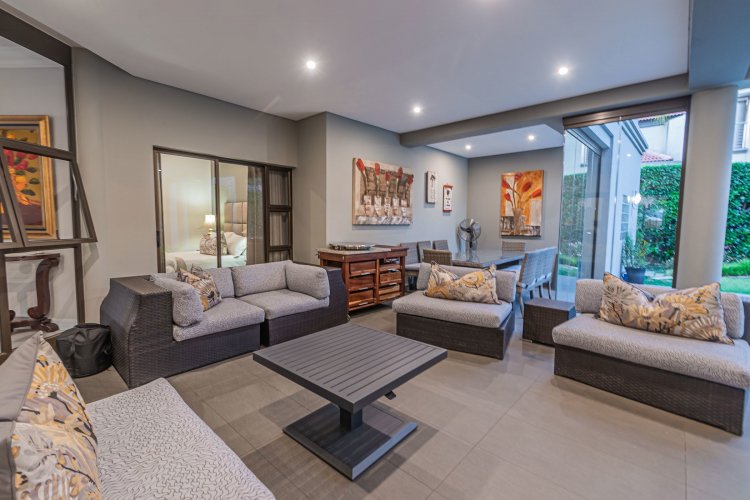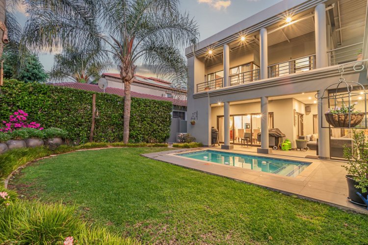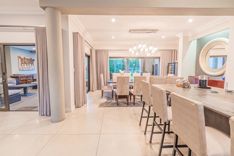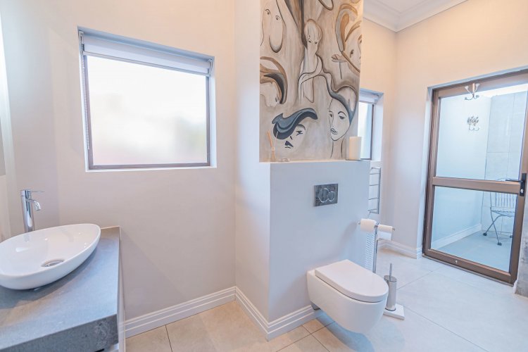 The moment you enter the house you are surrounded by luxury. A dream staircase, double volume entrance, open-plan living, a braai-stoep area with sliding doors and a wood burner in the living area with an adjacent dining room with the finest finishes, opening up to the stoep-braai patio overlooking the pool and garden.