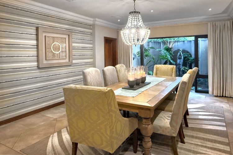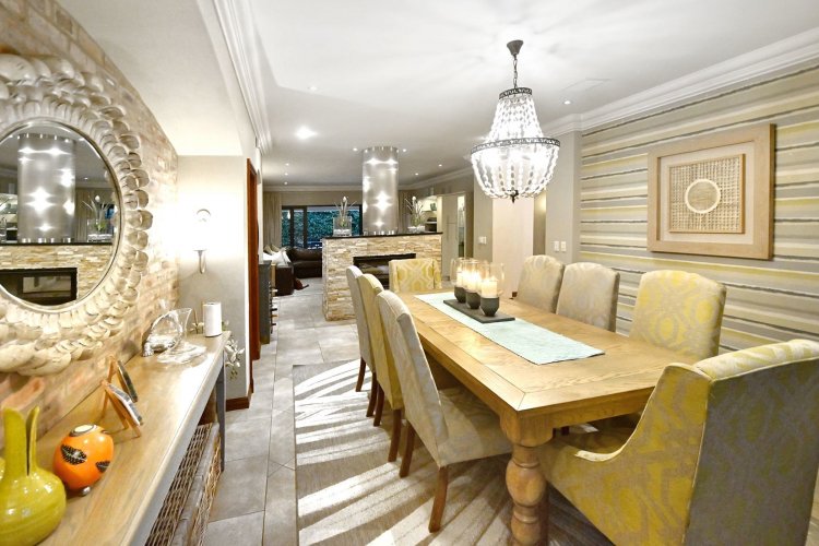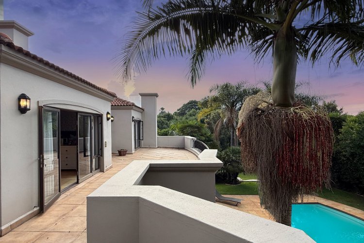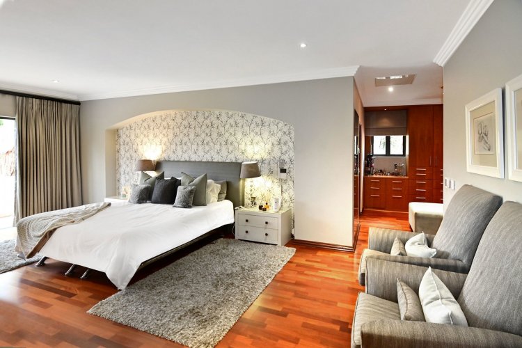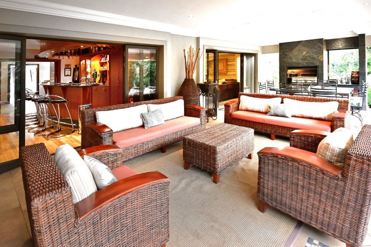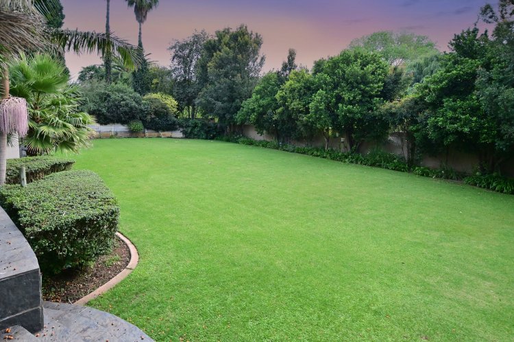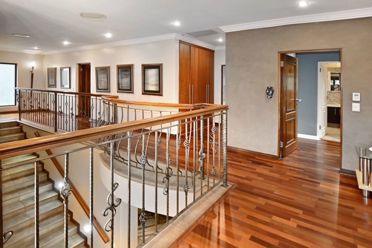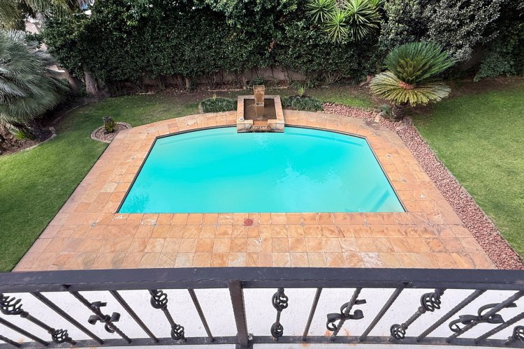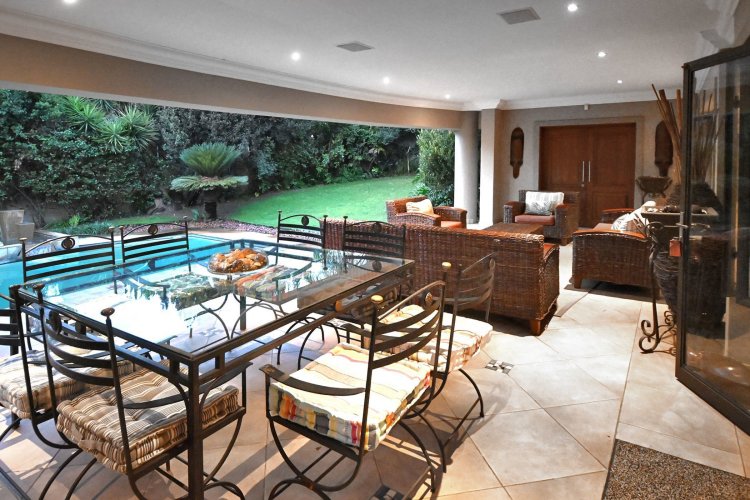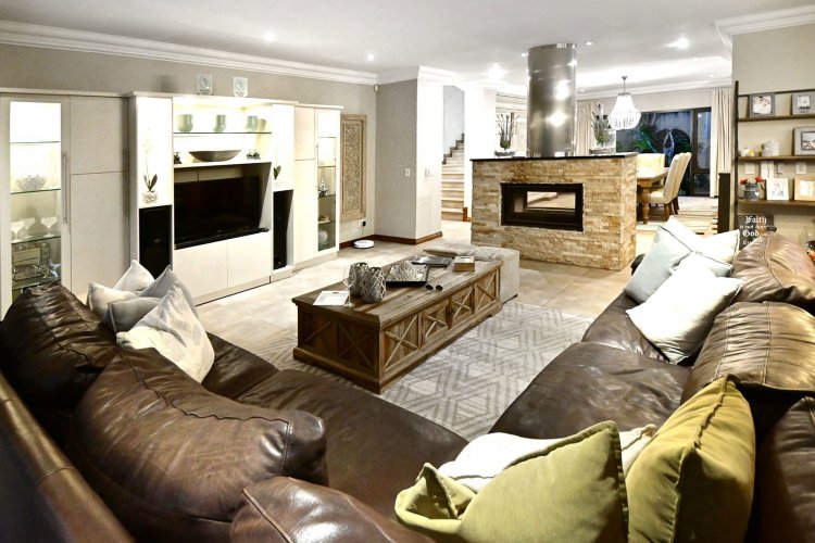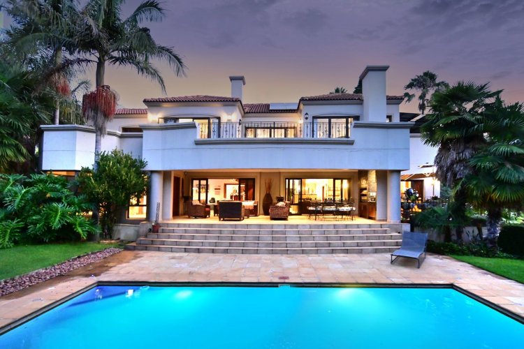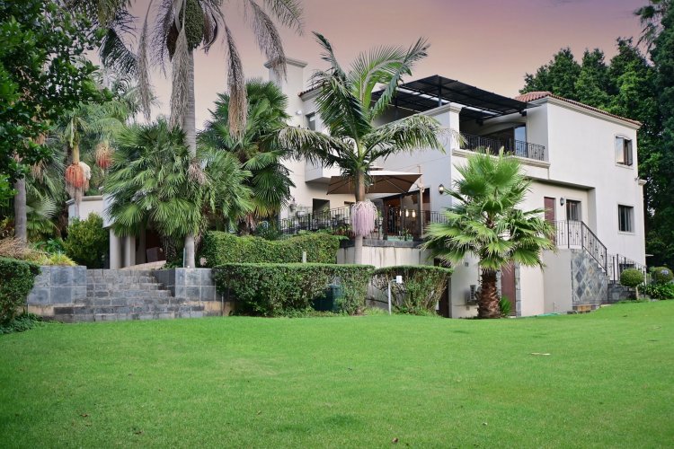 Standing tall and proud on a 2000m2 stand enveloped by the most magnificent established gardens with rolling lawns. Set deep within a high security guarded and gated cul-de-sac. Inspired by European design and tailored to our climate, the floor plan allows all the reception rooms to flow out the expansive undercover patio, built-in braai area and pool. From the front door to the garden, it is a delight. The double volume entrance hall sets the tone for the spacious living areas whilst a feature staircase leads upstairs to 4 bedrooms suites with pajama lounge and balconies overlooking tall trees and lush greenery. Whilst downstairs the family room is the heart of the home which is open plan to the dining room with double sided fireplace, beautifully appointed gourmet kitchen with a centre island and an amazing breakfast patio that opens out and overlooks the gardens. A separate entertainment wing holds a fully fitted gentleman's bar with games room, jacuzzi room and cinema room. Plus, a full solar system, borehole, wine cellar, hobby room/ study, piped music throughout, double garage, staff accommodation and ample guest parking. What more could you ask for?