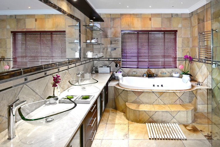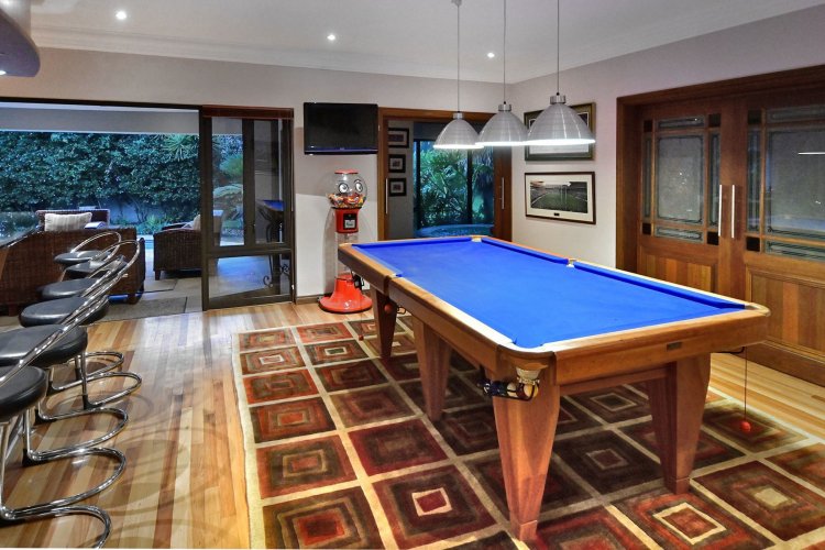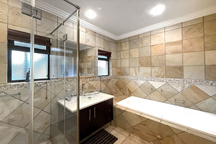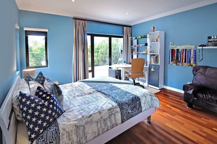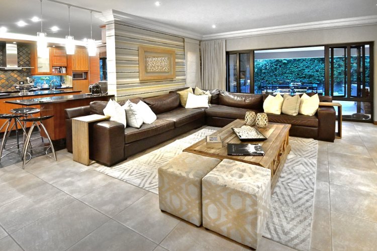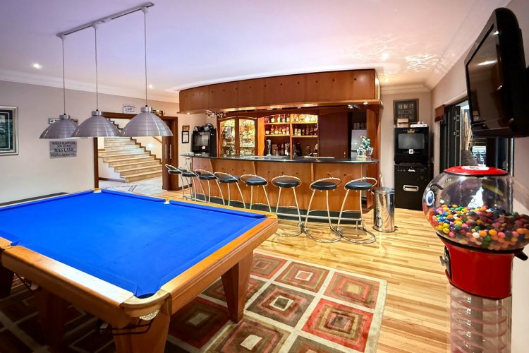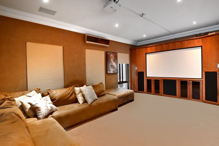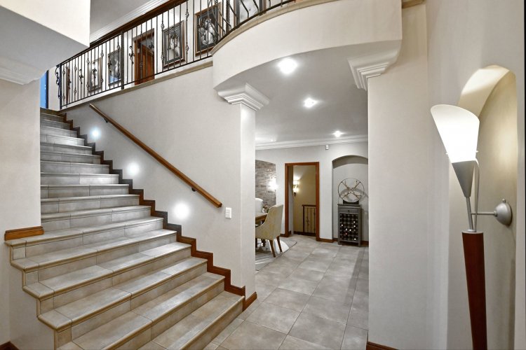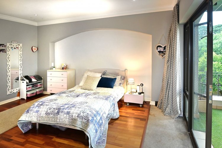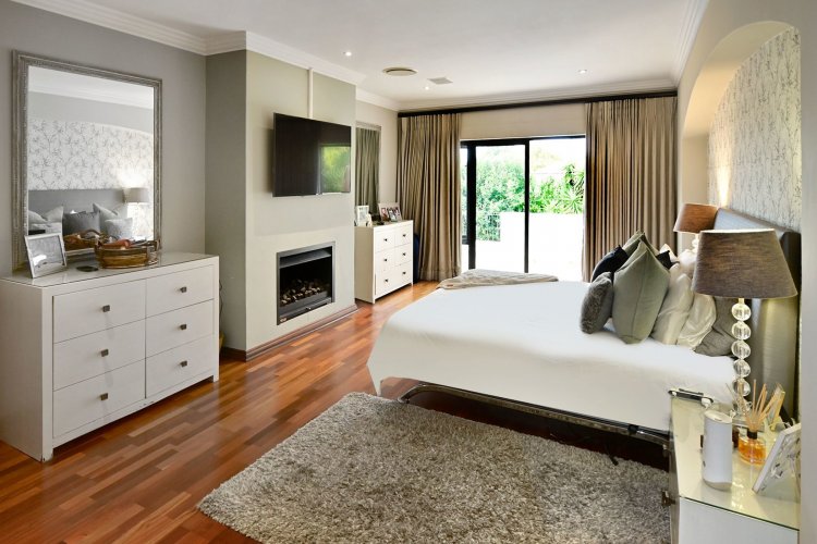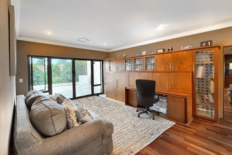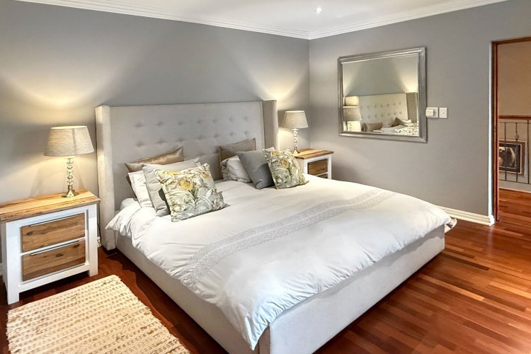 Standing tall and proud on a 2000m2 stand enveloped by the most magnificent established gardens with rolling lawns. Set deep within a high security guarded and gated cul-de-sac. Inspired by European design and tailored to our climate, the floor plan allows all the reception rooms to flow out the expansive undercover patio, built-in braai area and pool. From the front door to the garden, it is a delight. The double volume entrance hall sets the tone for the spacious living areas whilst a feature staircase leads upstairs to 4 bedrooms suites with pajama lounge and balconies overlooking tall trees and lush greenery. Whilst downstairs the family room is the heart of the home which is open plan to the dining room with double sided fireplace, beautifully appointed gourmet kitchen with a centre island and an amazing breakfast patio that opens out and overlooks the gardens. A separate entertainment wing holds a fully fitted gentleman's bar with games room, jacuzzi room and cinema room. Plus, a full solar system, borehole, wine cellar, hobby room/ study, piped music throughout, double garage, staff accommodation and ample guest parking. What more could you ask for?