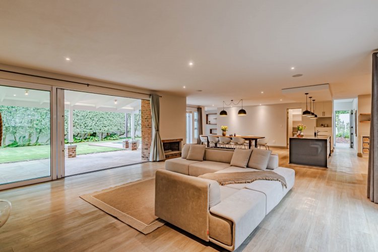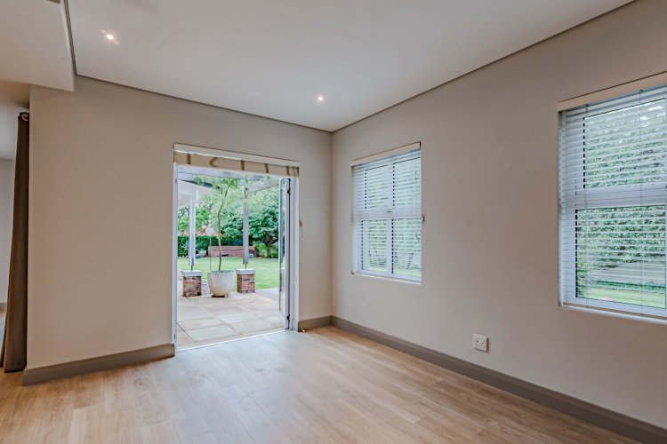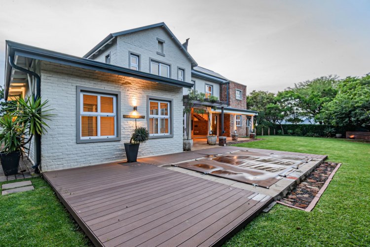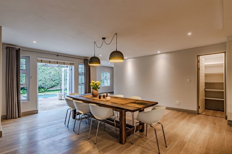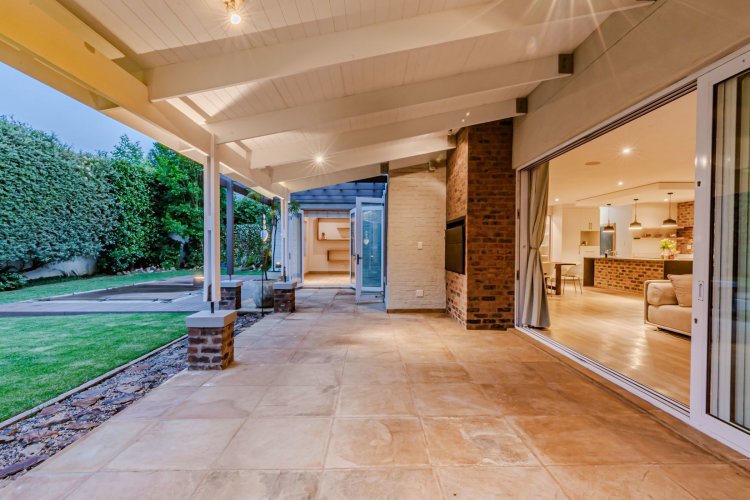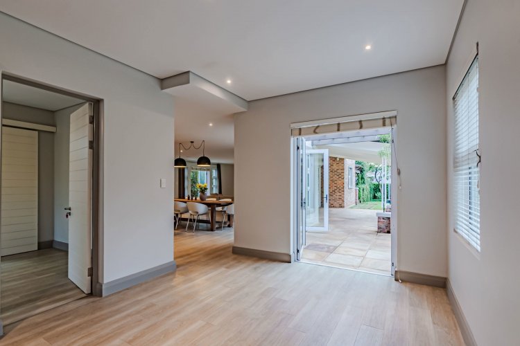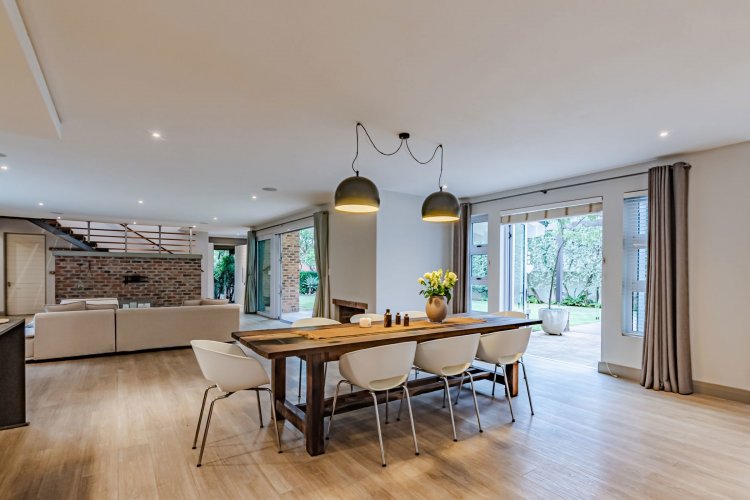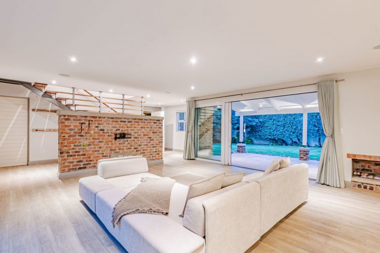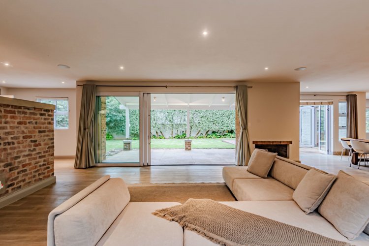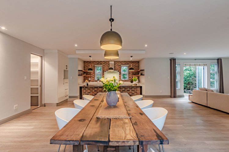 The heart of the home lies downstairs, where open-plan living creates a seamless flow between the family/TV room, dining area, and a contemporary kitchen. The kitchen is thoughtfully designed with a centre island and breakfast bar, perfect for relaxed family mornings or casual entertaining. Sliding doors from the living area open onto a covered patio with a built-in braai, extending your living space outdoors. Overlooking a sparkling swimming pool and a cosy boma area, this space is designed for year-round enjoyment and effortless entertaining. Multiple Sliding door and french doors open-up to invite nature throughout this home.