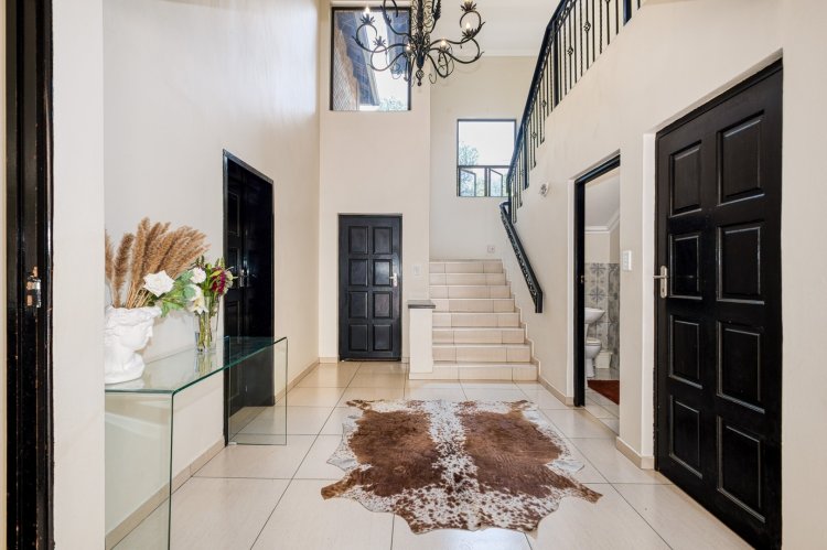 A unicorn wrapped in face brick,, this exceptional family residence, you are drawn by chandelier and high ceilings, and a uniquely designed baluster staircase in the entrance, combining refined finishes, spacious living, and secure estate living, this home is perfect for those who seek comfort, style, and convenience. A beautiful layout to the lounge, family, and dining room leading to a spacious garden ideal for both entertaining and relaxing.