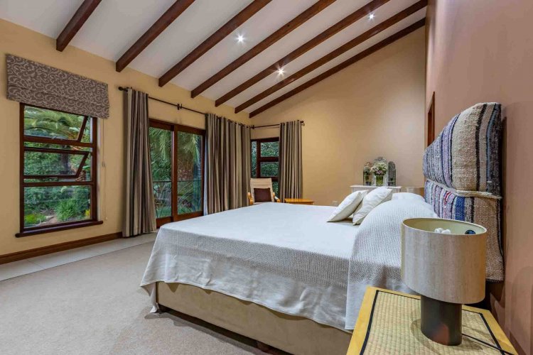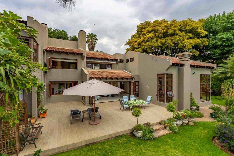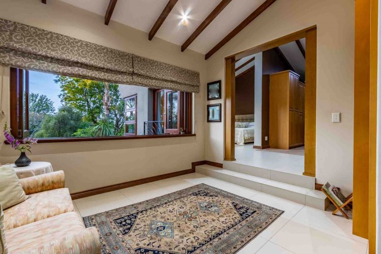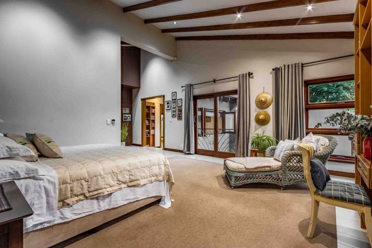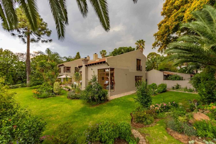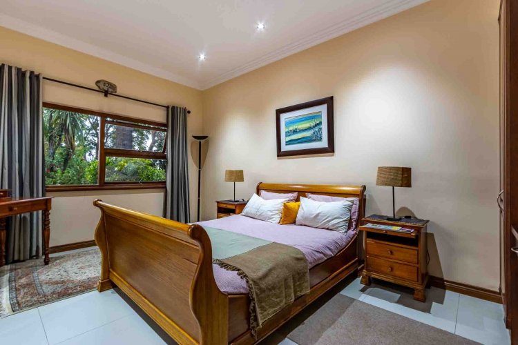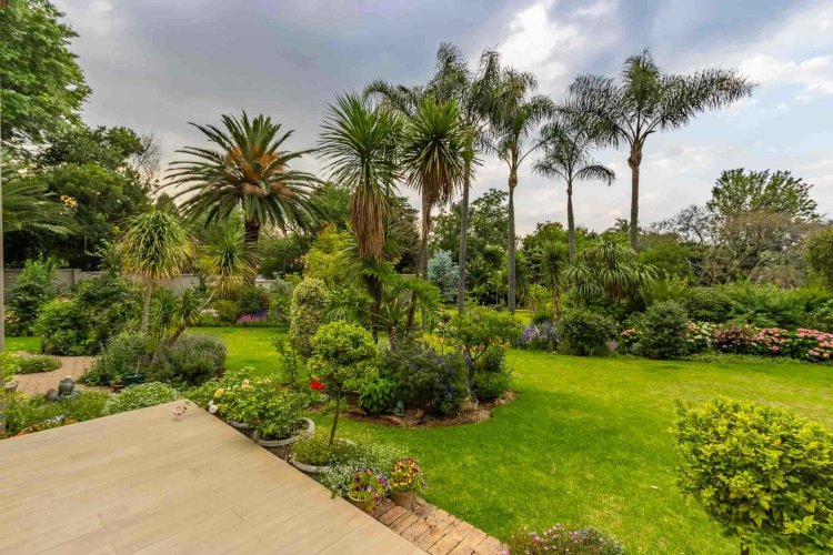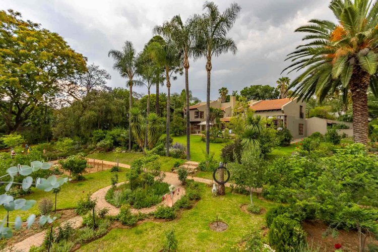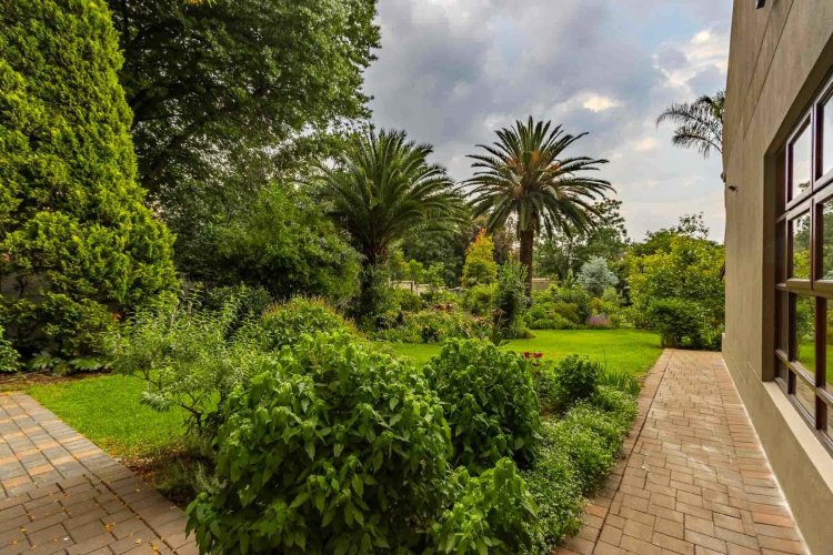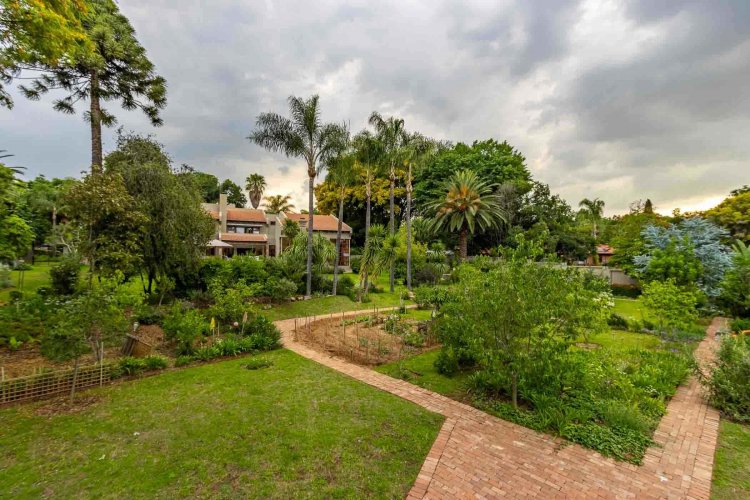 Impressive double volume entrance hall flowing into three spacious open plan living rooms with fireplace which open out to lush landscaped lawns and a beautiful treed garden with several fruit trees and herb gardens. Irrigation system A gardener's delight with a borehole.