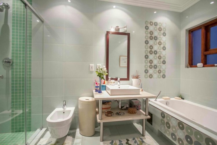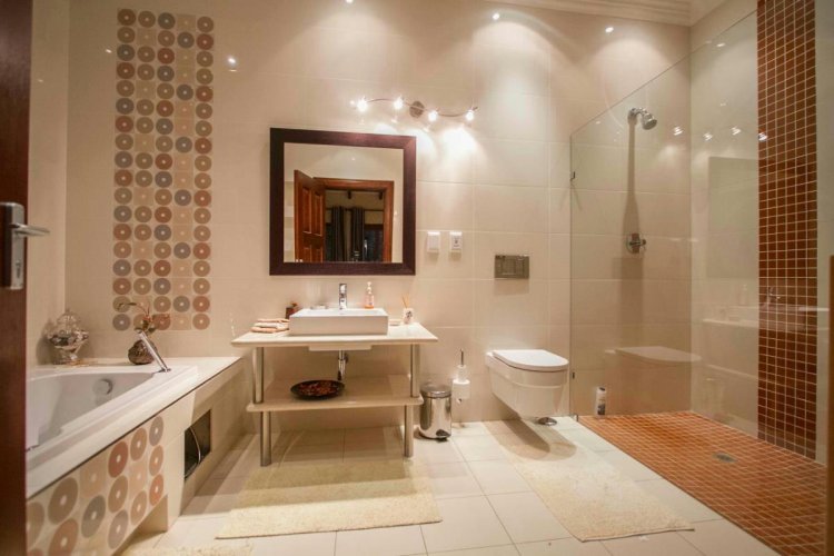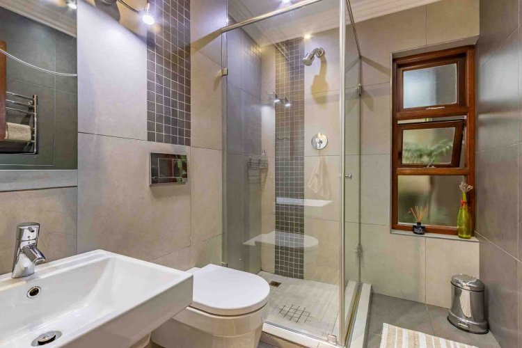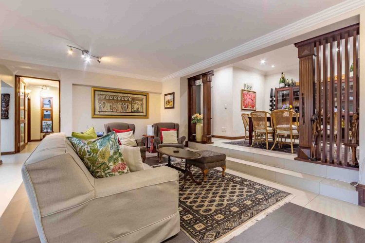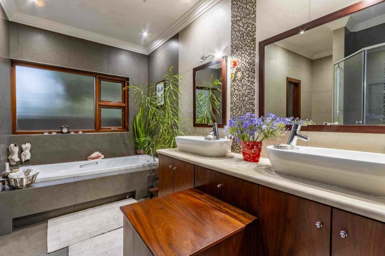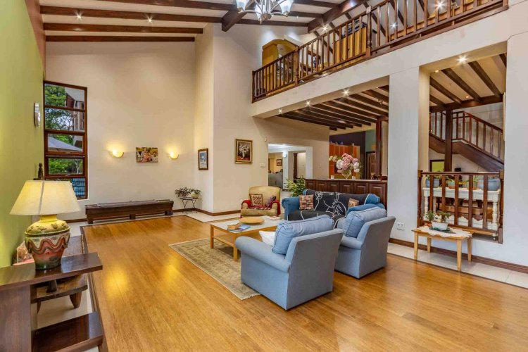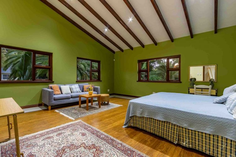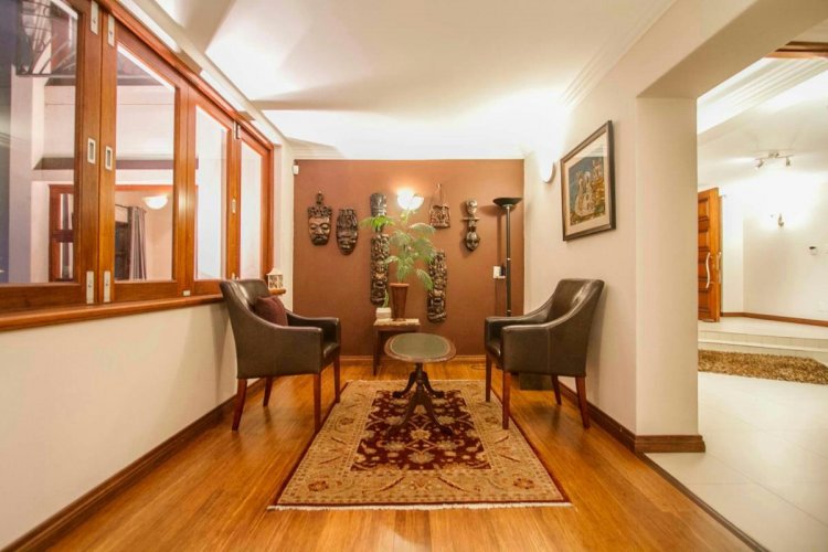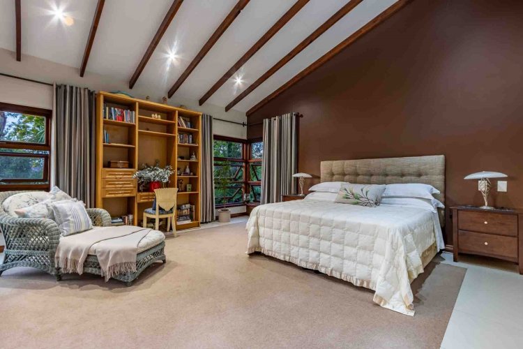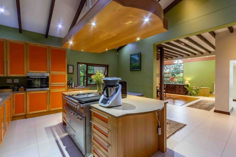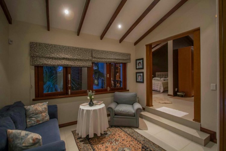 Impressive double volume entrance hall flowing into three spacious open plan living rooms with fireplace which open out to lush landscaped lawns and a beautiful treed garden with several fruit trees and herb gardens. Irrigation system A gardener's delight with a borehole.