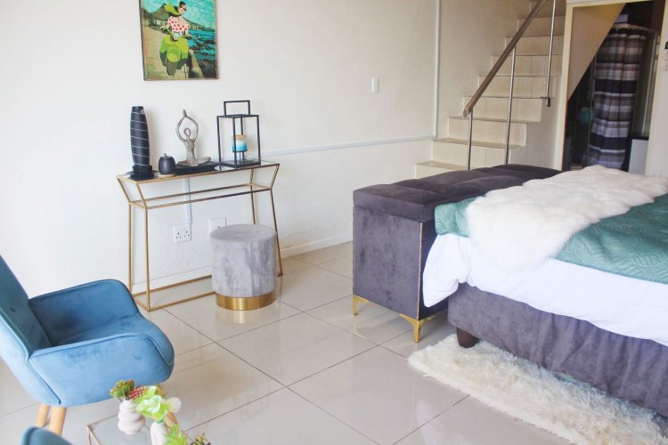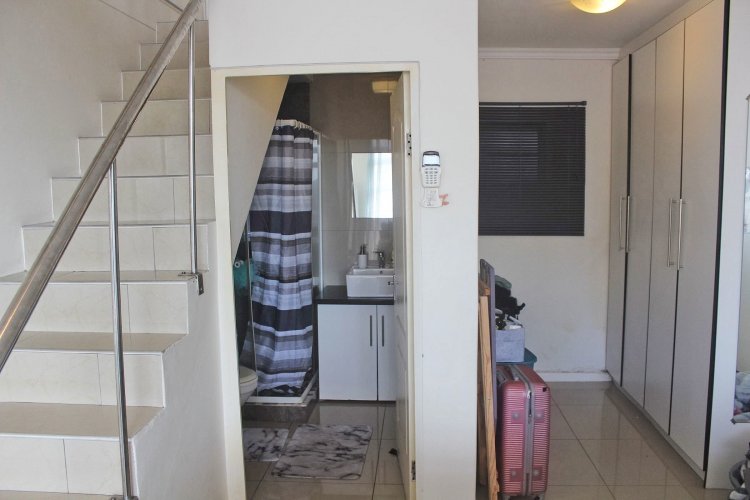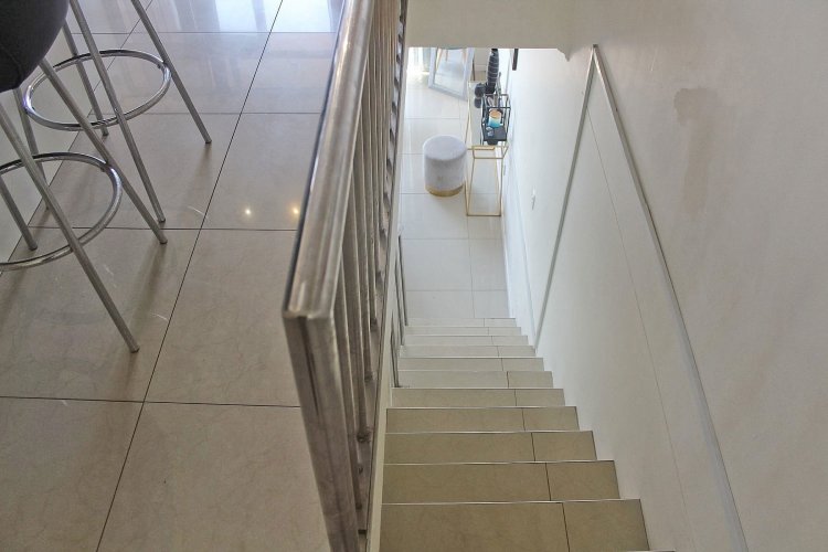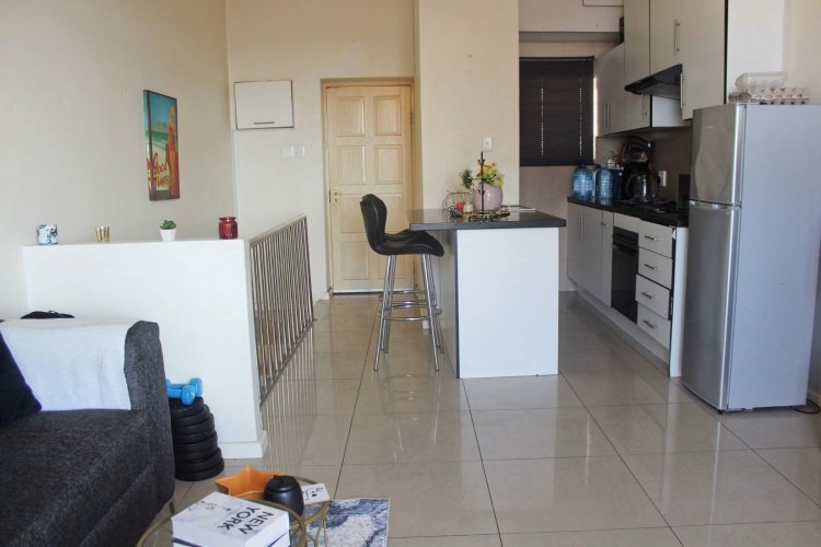 The flat consists of an open-plan bedroom with lots of cupboards and a bathroom at the bottom of the stairs, and a spacious upper level with elegant glossy porcelain floor tiles. In addition to a trendy white kitchen with granite tops, fitted hob, undercounter oven, extractor fan, and sociable breakfast counter, there's also a lounge with sliding doors to a balcony.