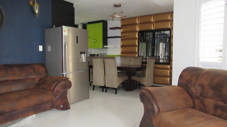 The heart of the home is the spacious open-plan living area, where the kitchen, dining, and lounge flow effortlessly together. This inviting space is perfect for entertaining friends or enjoying quiet evenings at home. The modern kitchen is thoughtfully designed with stylish cupboards and a fitted stove, offering both functionality and flair for everyday cooking.