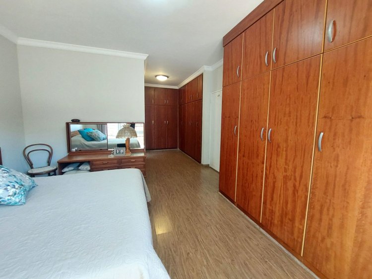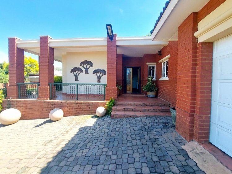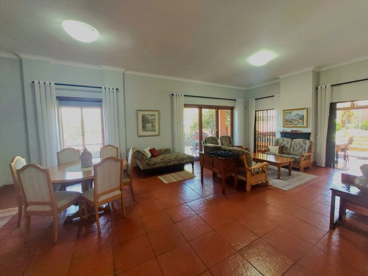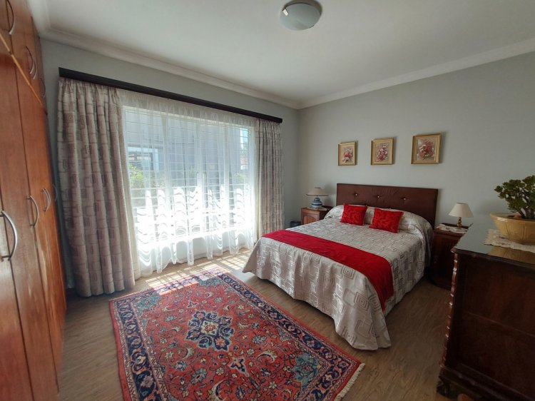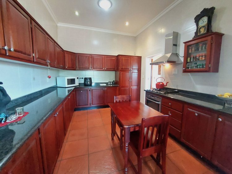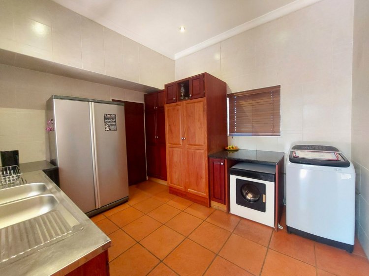 The kitchen, conveniently positioned next to the lounge, features beautiful Rosewood built-in cupboards, granite countertops, and a gas stove with electric oven. A separate scullery provides additional appliance space and direct access to the garage, while a sunlit sunroom/study offers an ideal work-from-home space.