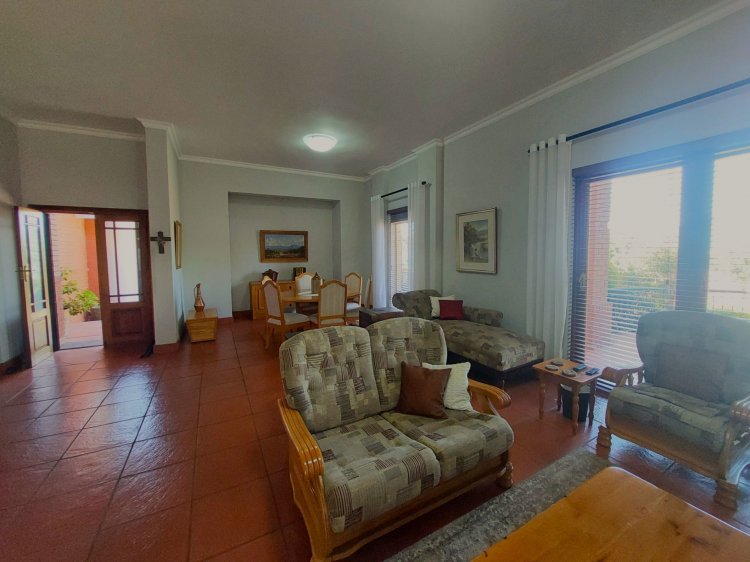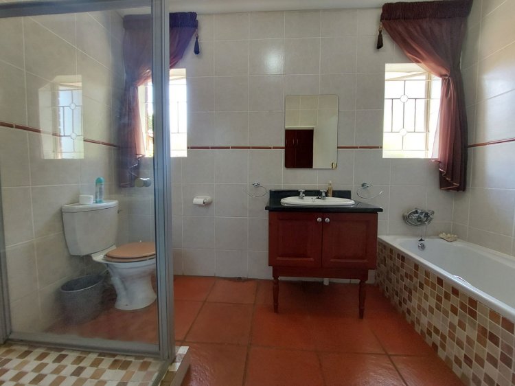 The home offers three spacious bedrooms with laminated flooring and built-in cupboards. Two guest bedrooms share a full bathroom and a separate guest toilet, while the main bedroom boasts generous cupboard space, direct garden access, and a luxurious full en-suite bathroom. An Inverter with Battery and three Solar Panels ensure that your electricity needs are sorted.