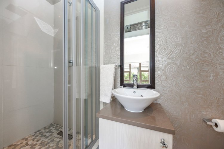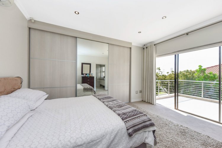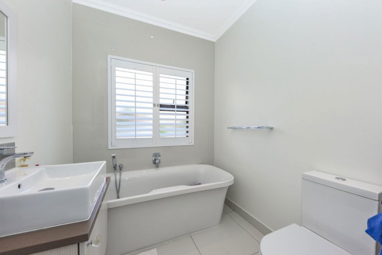 Upstairs, the home offers three generously sized bedrooms, all with built-in cupboards and air-conditioning. The main and second bedrooms feature beautifully finished en-suite bathrooms and open onto a large private balcony overlooking the garden and pool, providing a tranquil retreat. The third bedroom is well-proportioned and also includes its own en-suite bathroom, ideal for family or guests.