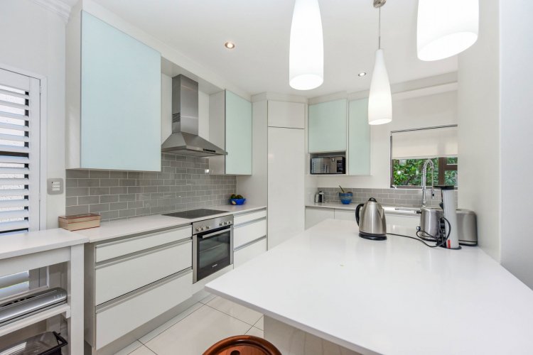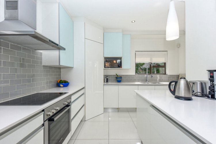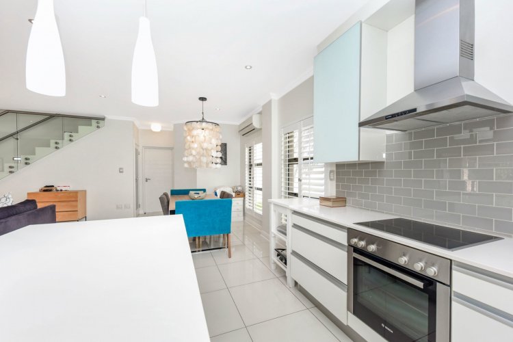 The contemporary kitchen is stylish and functional, offering sleek cabinetry, generous cupboard space, quality countertops, built-in appliances, and a central island that serves as both a practical workspace and social hub. A glass balustrade staircase adds a striking architectural element, enhancing the home's modern, airy design.