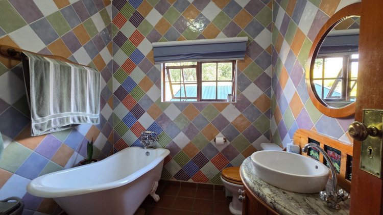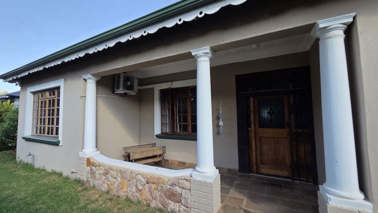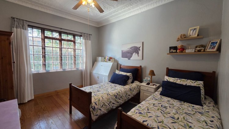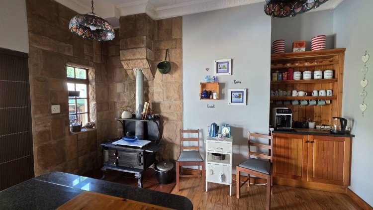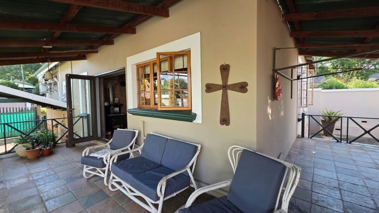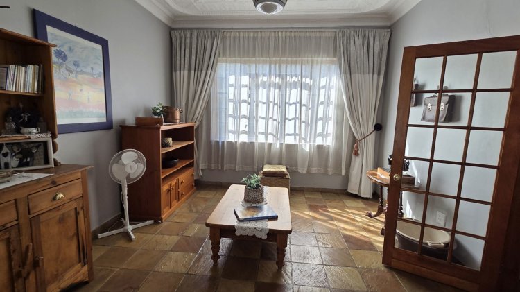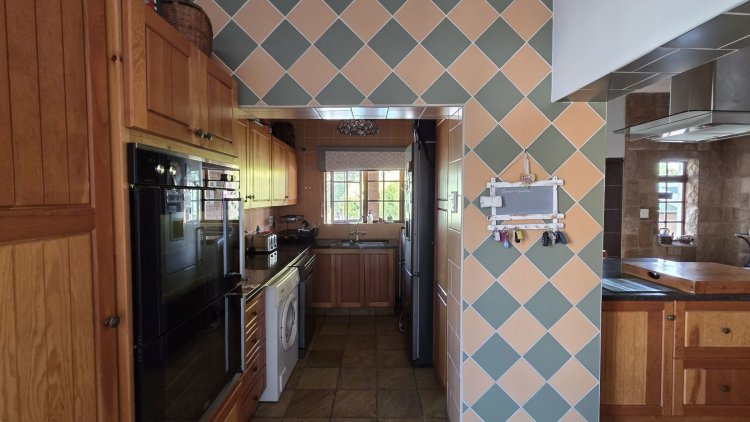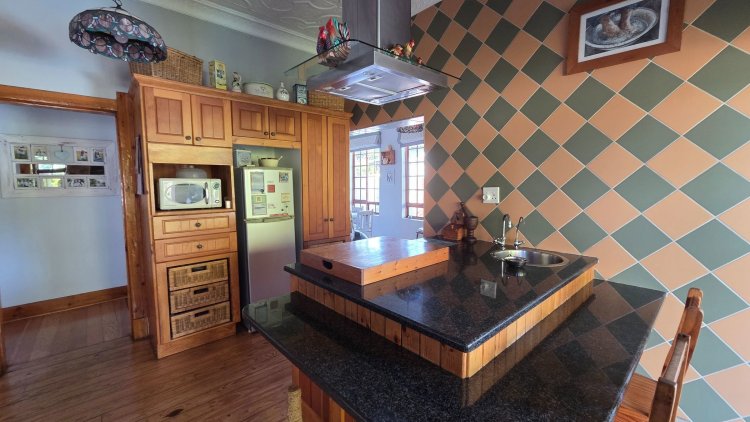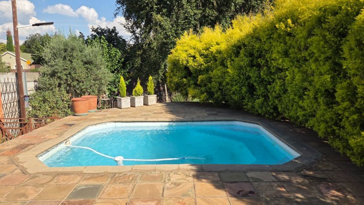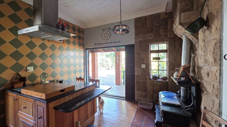 The country-style kitchen is spacious and inviting, with great potential to renovate or personalise. A stack door opens directly to the swimming pool and covered patio with built-in braai, making this home ideal for entertaining.