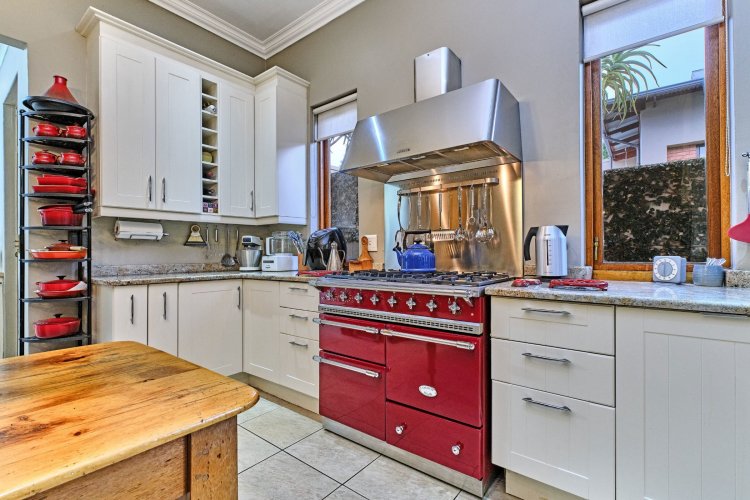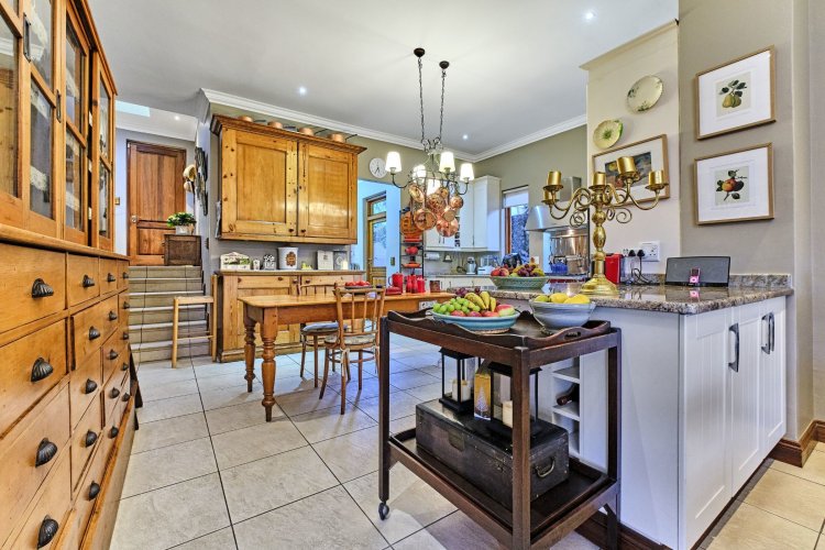The heart of the home is its charming country-style kitchen, a space that blends warmth with functionality. Featuring granite countertops, bespoke cabinetry, a Lacanche stove, and a separate scullery, the kitchen carries a quiet luxury that complements the home's classic aesthetic.