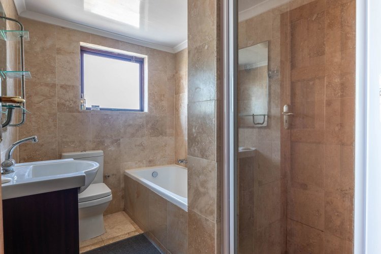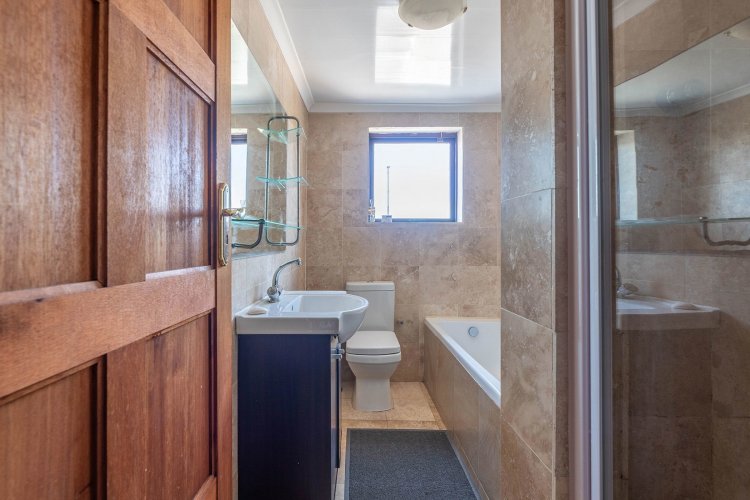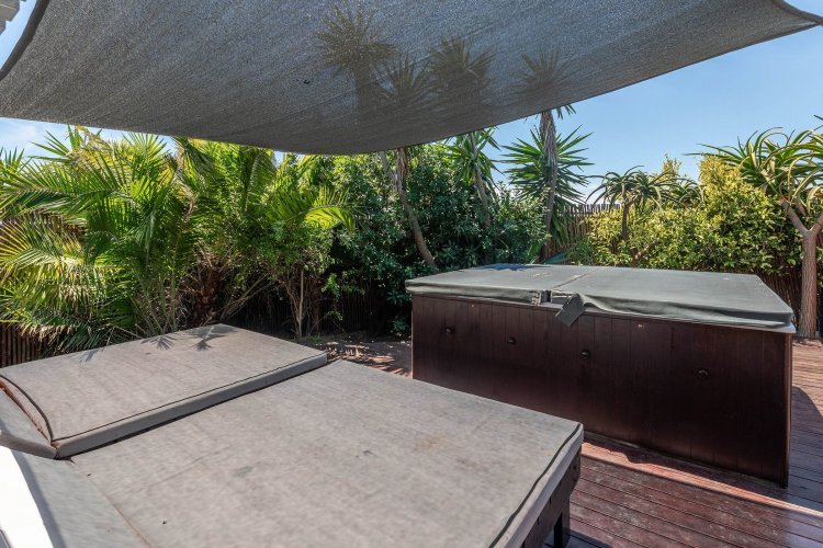 Upstairs, you'll find two bedrooms — including a main with a walk-in closet — as well as a stylish family bathroom. The entertainment room with an enclosed balcony offers partial sea views, ideal for gatherings in any weather.