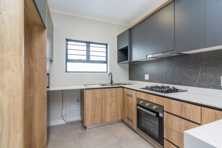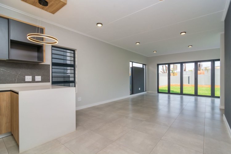 Elegant open plan kitchen design with two-toned cabinets and engineered stone counter tops. Boasting open plan living with lounge and stacking doors opening onto generous garden, perfect for outdoor play or relaxation.