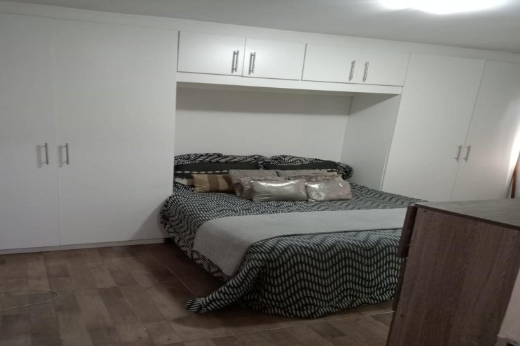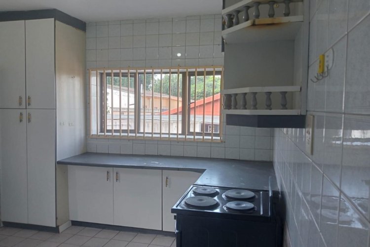 Fully fitted kitchen with ample cupboard space, adjacent to a downstairs bedroom.