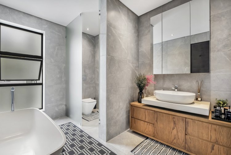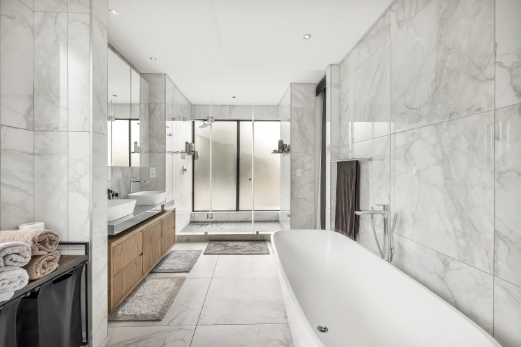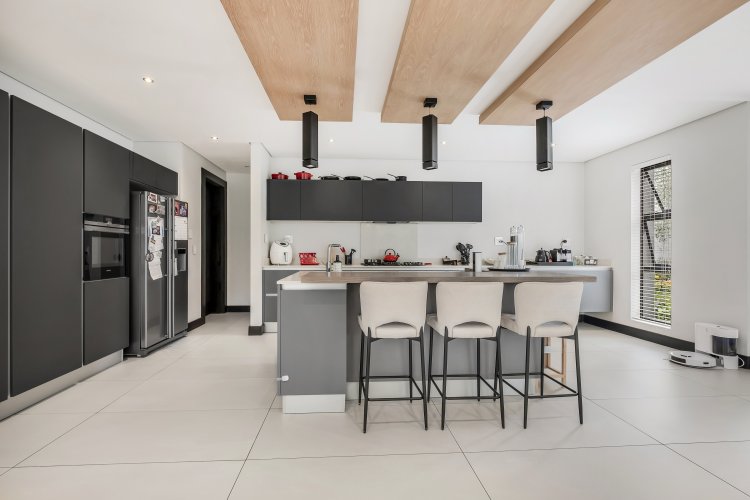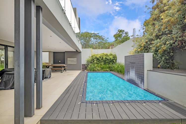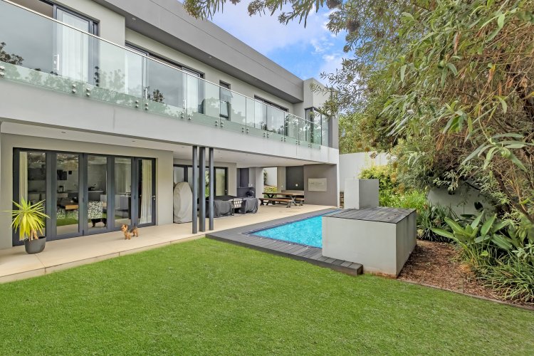 From the moment you enter through the oversized glass door into a triple volume entrance hall, the attention to detail, and quality of build is evident. Strategically placed for ease of entertaining, the streamlined Euro Casa kitchen becomes the focal point of the reception areas, which open out to the covered patio & cocktail bar. Points to ponder : Ducted aircon, underfloor & carpet heating, wooden flooring, Van Dyck carpets, Giberit flush systems, Hansgrohe & Duravit fittings, gas braai , Dado quartz baths, solar geyser, wooden decking, Siemens appliances, staff suite, double garage & guest parking. Exclusive complex of 4 individually designed homes with 24hr security. Asking R11 450 000 plus VAT.
