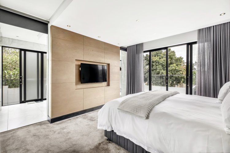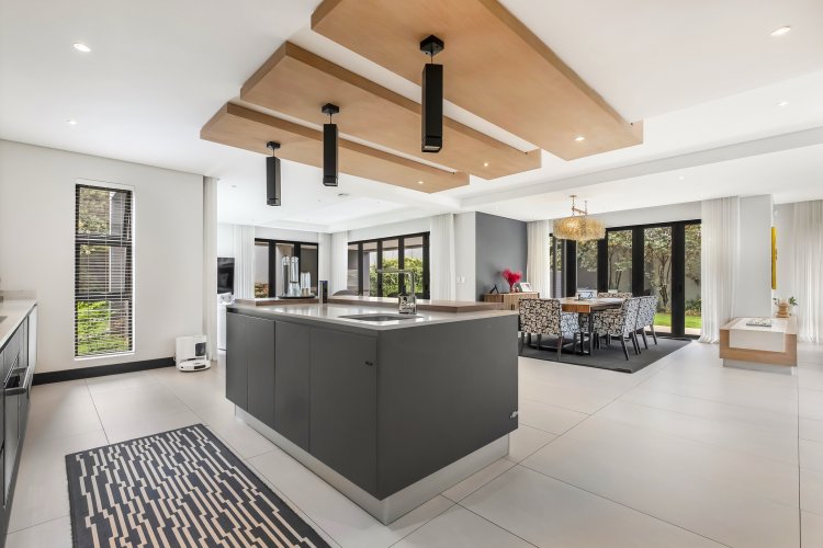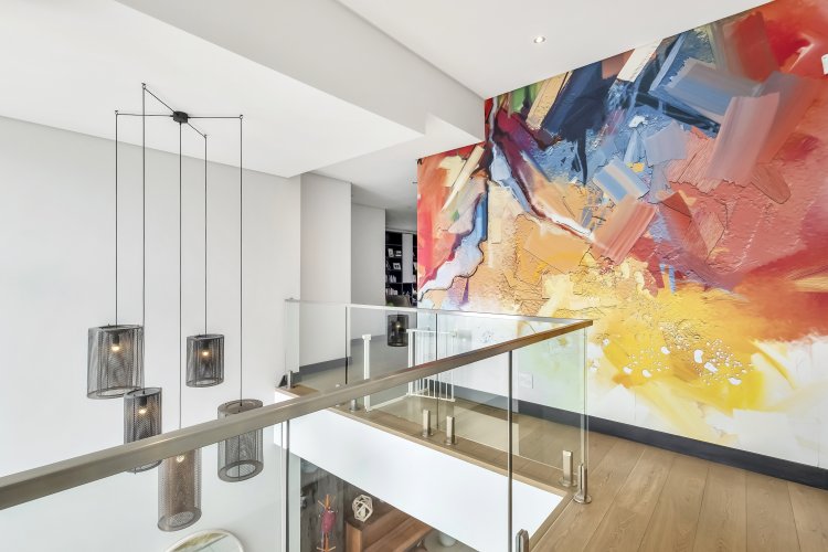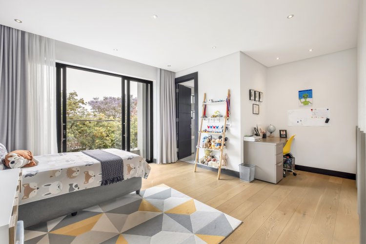 A fine example of progressive architecture! The carefully selected attention grabbing interiors, enhance the open plan living experience. This, together with the expansive patio allows the outside to blend harmoniously with the interiors. Natural light is encouraged by the use of large windows, whilst the floating staircase sweeps the eye up to the second level - 4 en suite bedrooms with a central pyjama lounge. The luxurious main bedroom includes a large dressing room, exquisite bathroom, private balcony & views of Sandton!