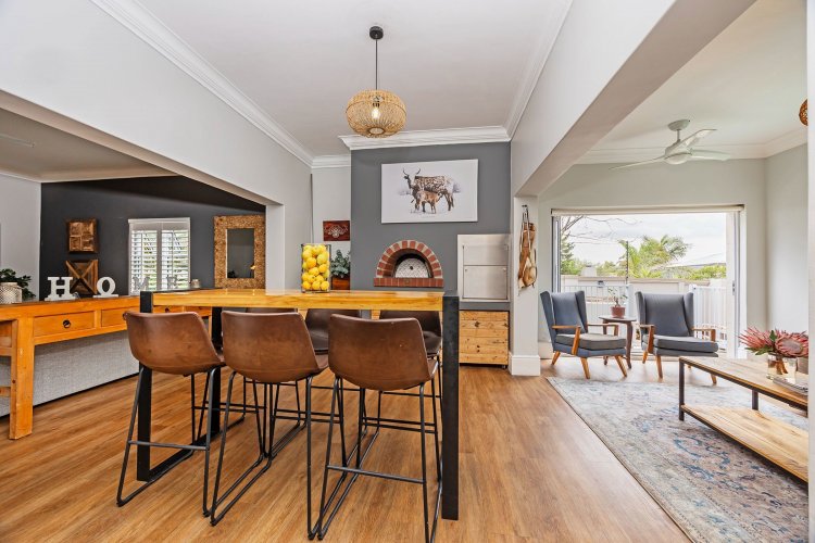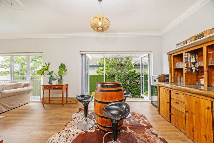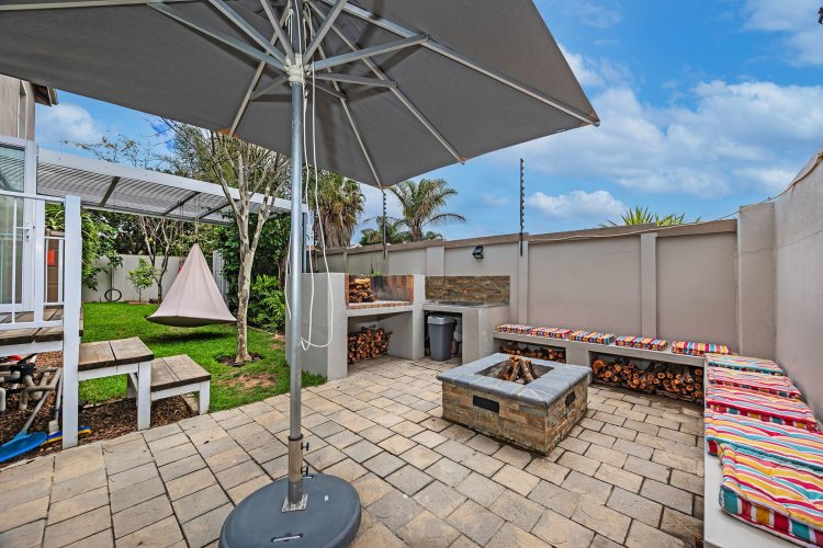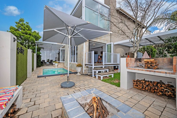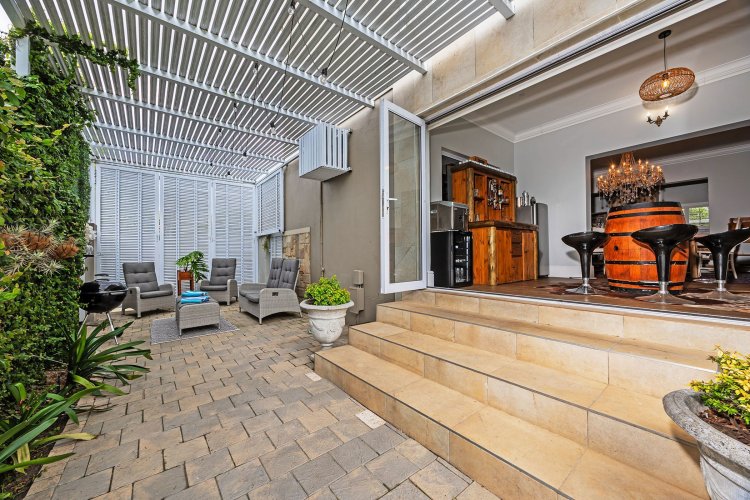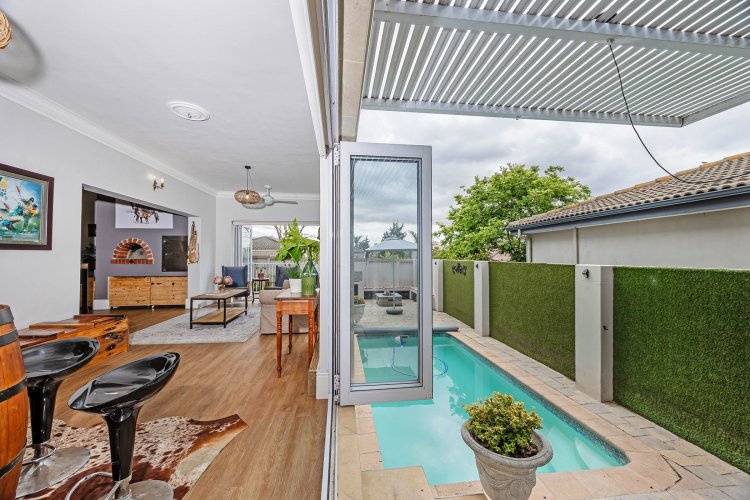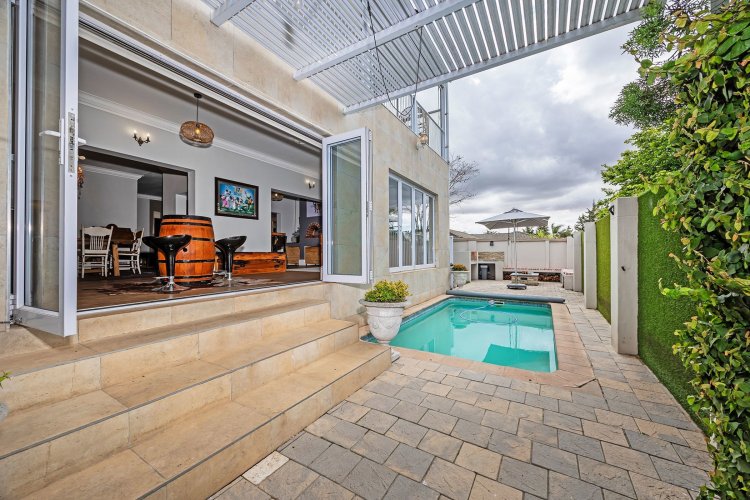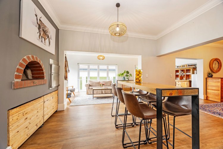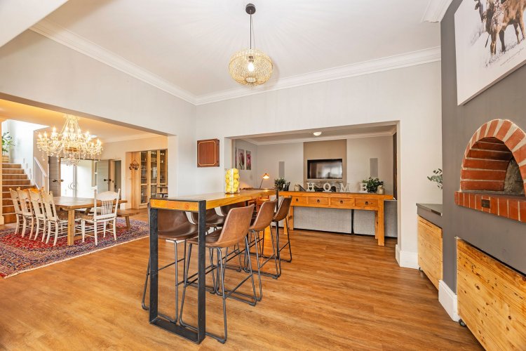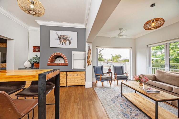 The lounge with a cozy fireplace flows seamlessly into an expansive entertainment area — complete with a built-in pizza oven, braai, and stacking doors that open out to the lush garden. Here, you'll find a sparkling pool, boma braai, and a generous outdoor living space — a dream setting for summer days and starlit evenings.