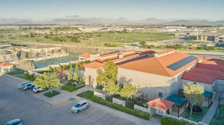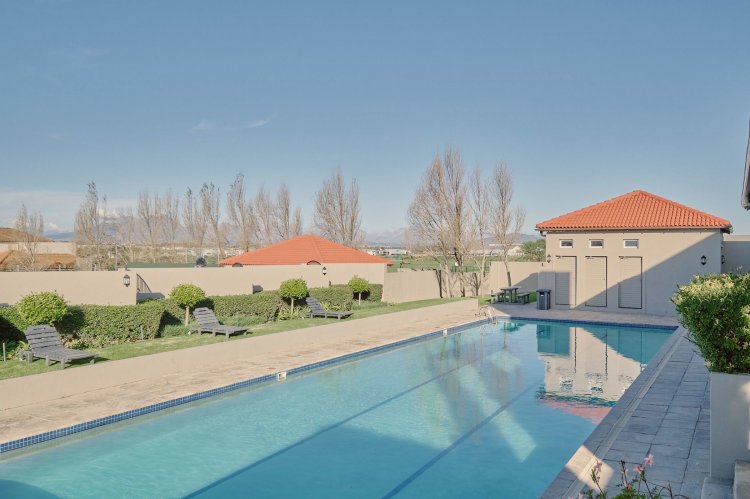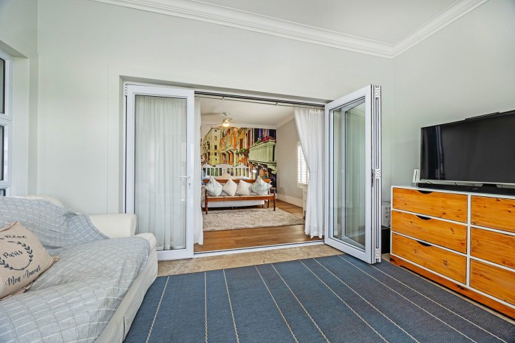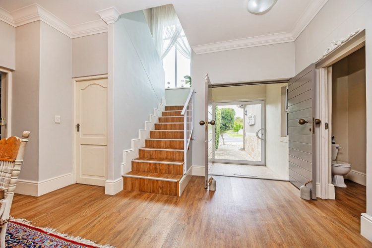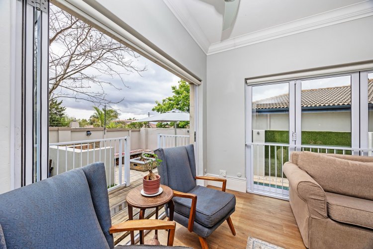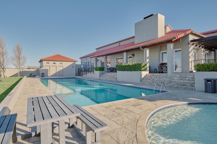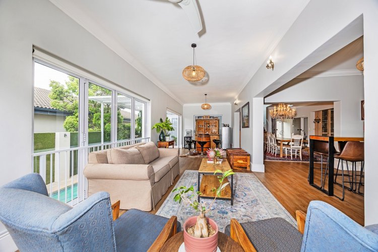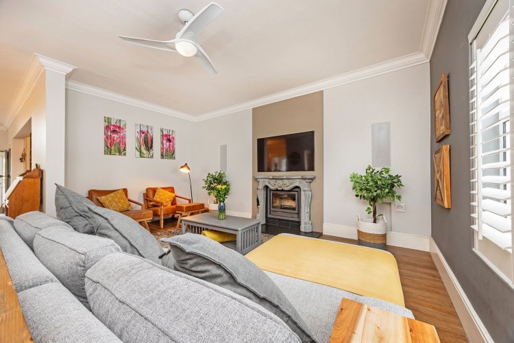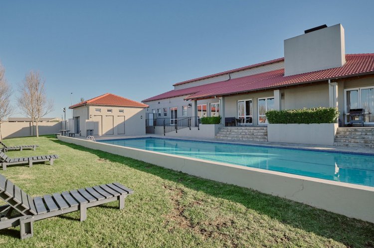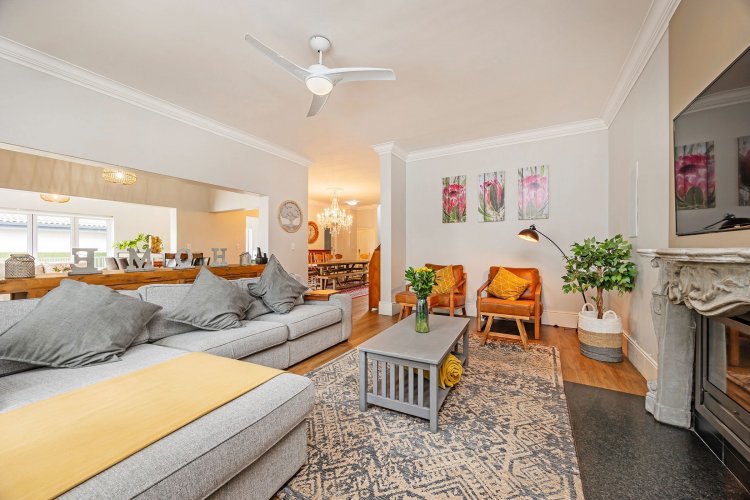 The lounge with a cozy fireplace flows seamlessly into an expansive entertainment area — complete with a built-in pizza oven, braai, and stacking doors that open out to the lush garden. Here, you'll find a sparkling pool, boma braai, and a generous outdoor living space — a dream setting for summer days and starlit evenings.