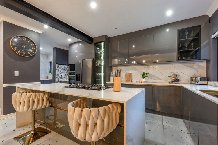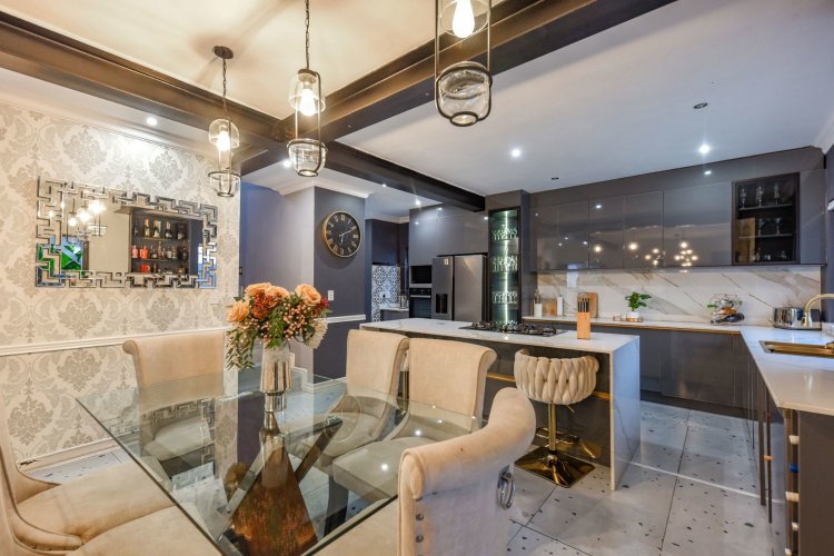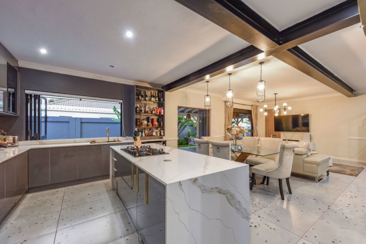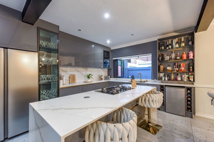 Newly renovated open plan Caesar stone kitchen with soft touch cupboards and drawers, gas hob, eye-level oven, space for a double door fridge and separate scullery.