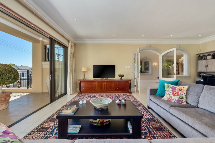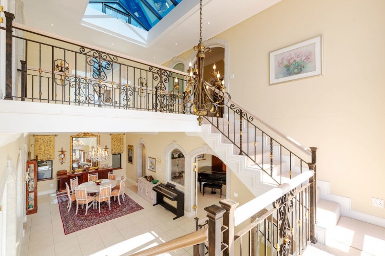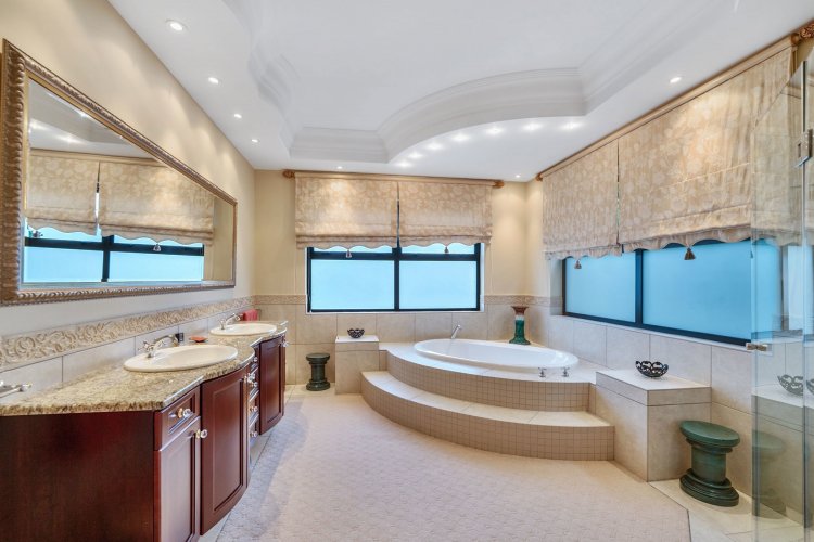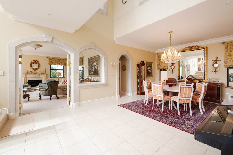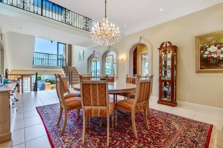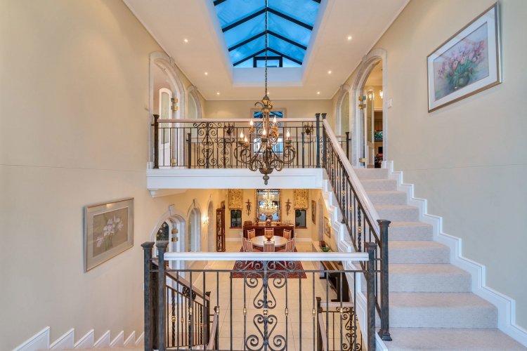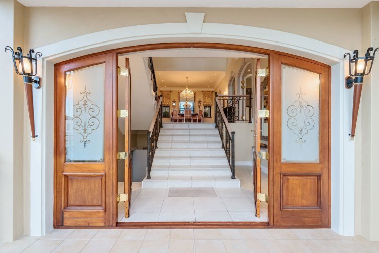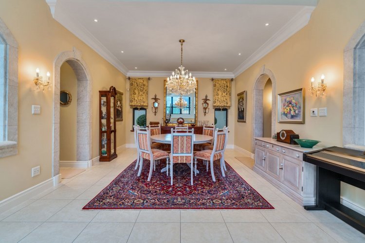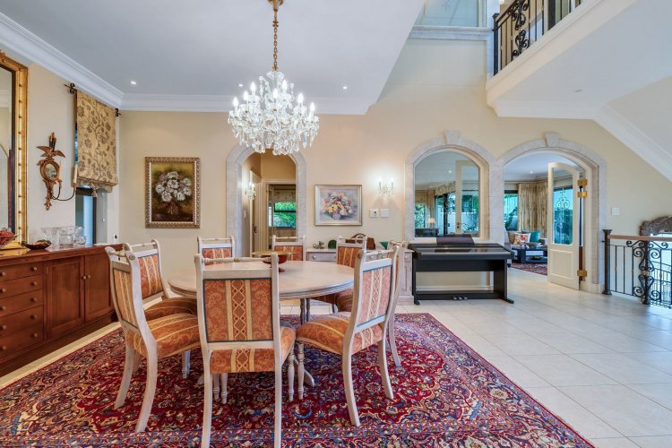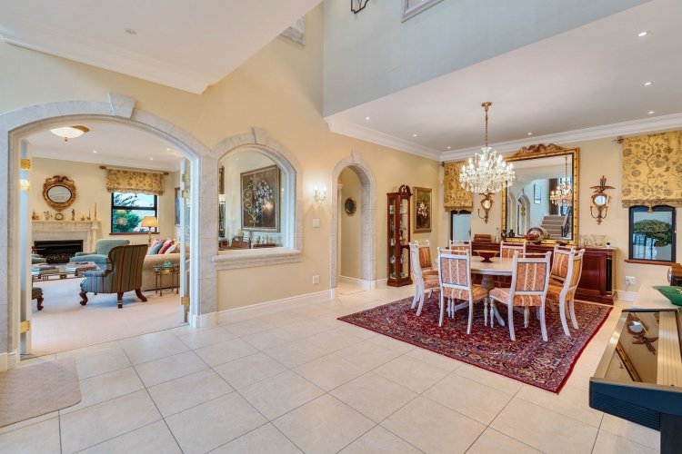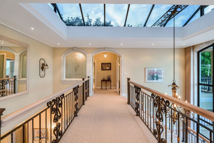 Skylights & stacked glass doors draw in sunlight throughout the day, illuminating elegant finishes & refined reception areas. A series of crystal chandeliers lend a sense of old-world grace across the home, complementing the balance between formal & informal spaces.