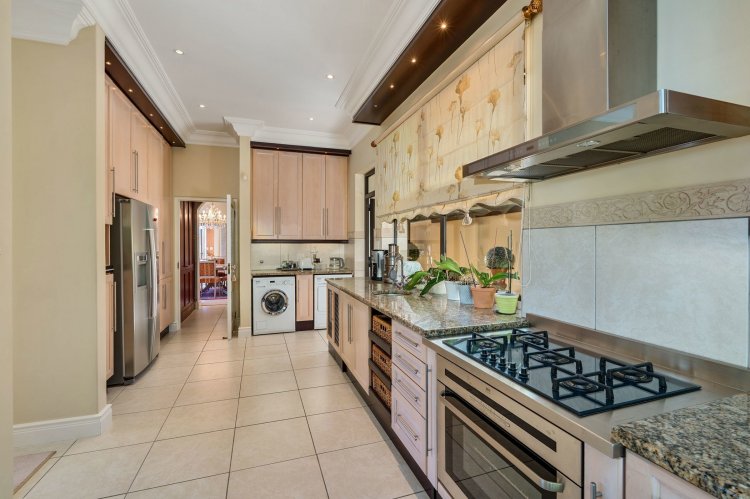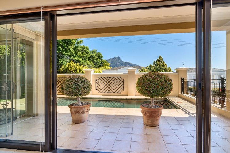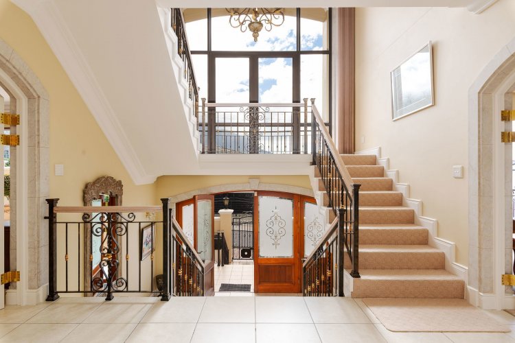 The 1st floor level boasts a generous open-plan living area that flows seamlessly onto a covered veranda & swimming pool—ideal for both relaxed family-living & entertaining. The kitchen features a gas stove & provides direct access to practical service areas, including a washing line, geyser room/ storeroom, along with an external toilet. A formal lounge with high ceilings & a gas fireplace captures breath-taking mountain views, while the adjacent formal dining room is framed by a dramatic chandelier & elevated on the central double-volume landing.