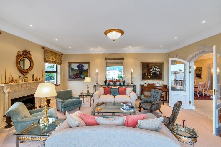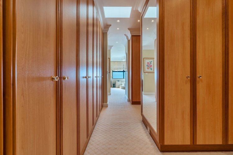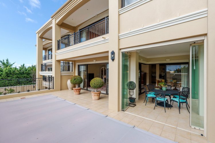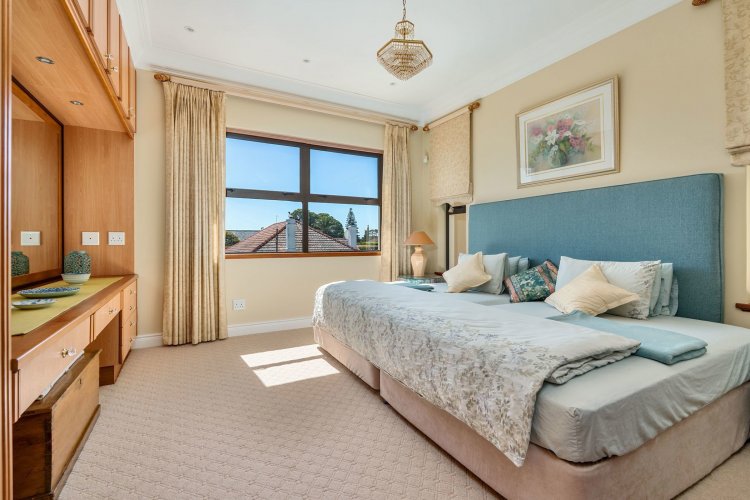 Accommodation on this level includes a guest bedroom with built-in cupboards & en suite bathroom with shower, alongside an additional guest bathroom & storage space. Below, a four-car tiled tandem garage offers ample built-in storage & holds the potential to be converted into staff quarters if desired.