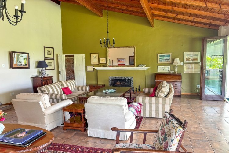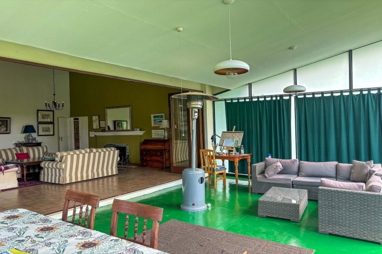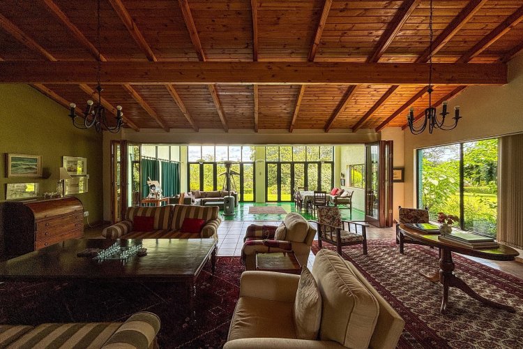 Open plan is the feeling you get as you enter the hallway and into the dining area which leads onto the lounge with a large wooden fireplace. There are sacking doors which give you access to the large modern enclosed entertainment area which also have stacking doors leading onto the magnificent gardens with excelent views.