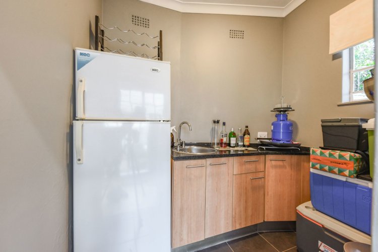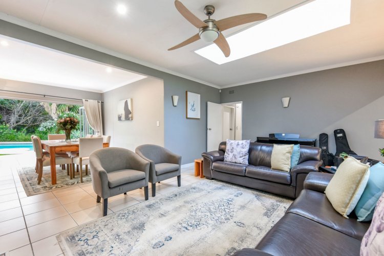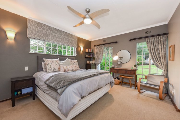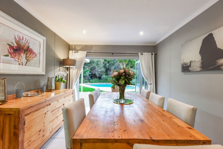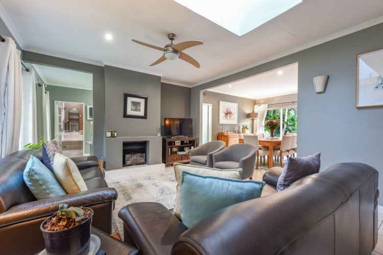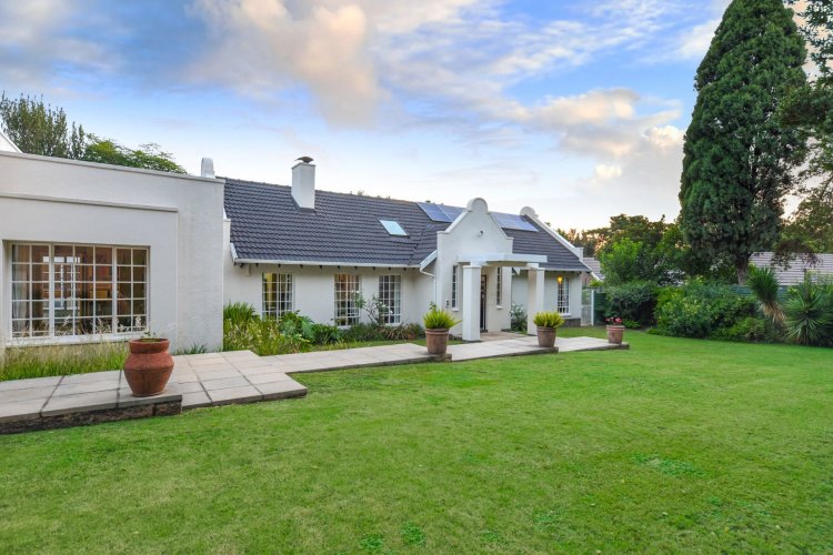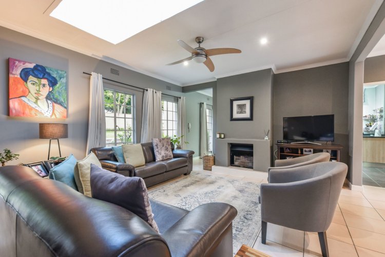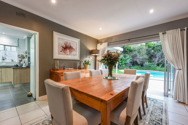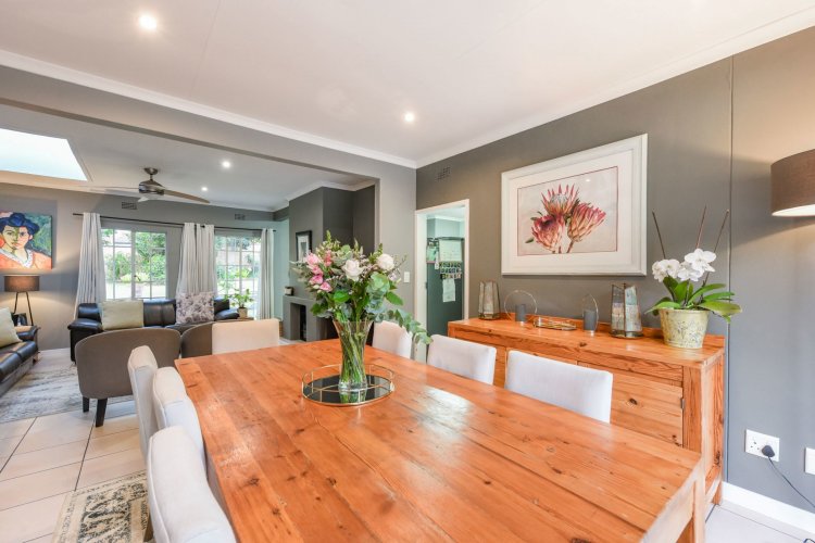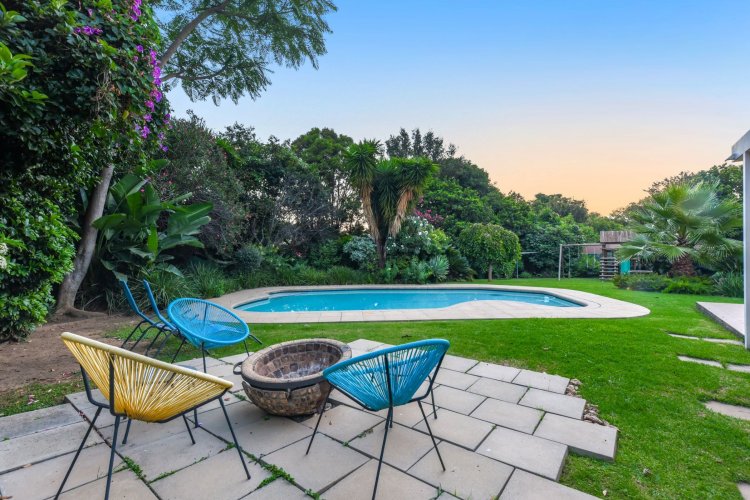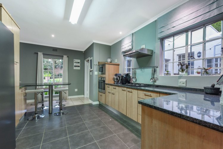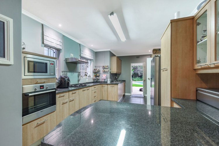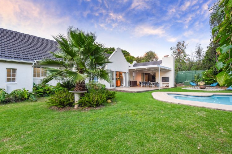 The entrance hall and lounge feature a skylight and have a garden setting, as well as a fireplace, perfect for those Johannesburg winter evenings. The dining area opens up through stacker doors onto the outside garden, which boasts a large pool and incredible landscaped garden. The kitchen is fully equipped with granite tops, gas hob, built in oven and microwave, as well as an extractor fan and scullery.