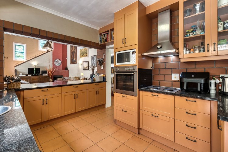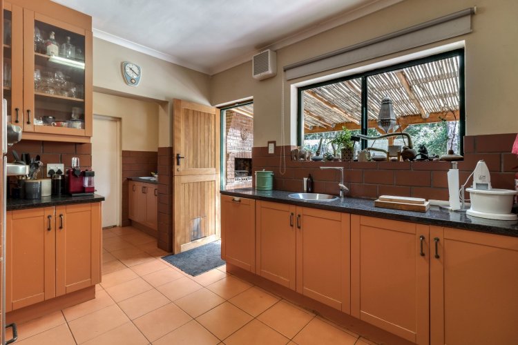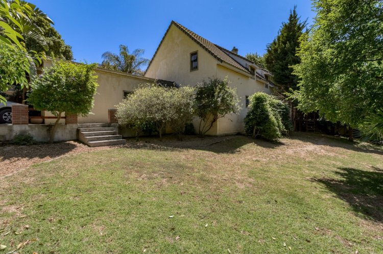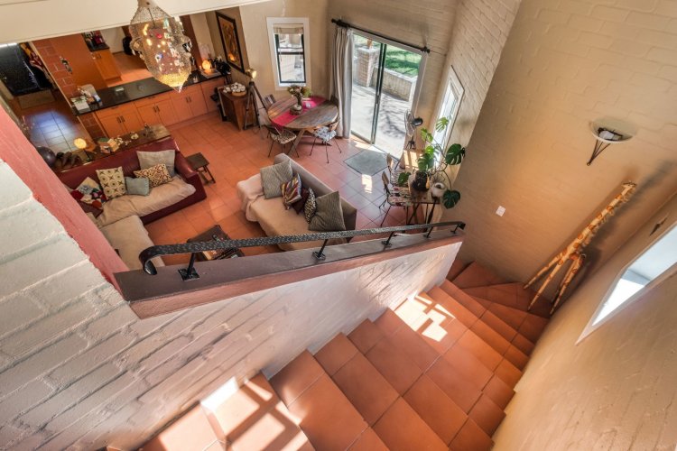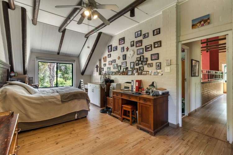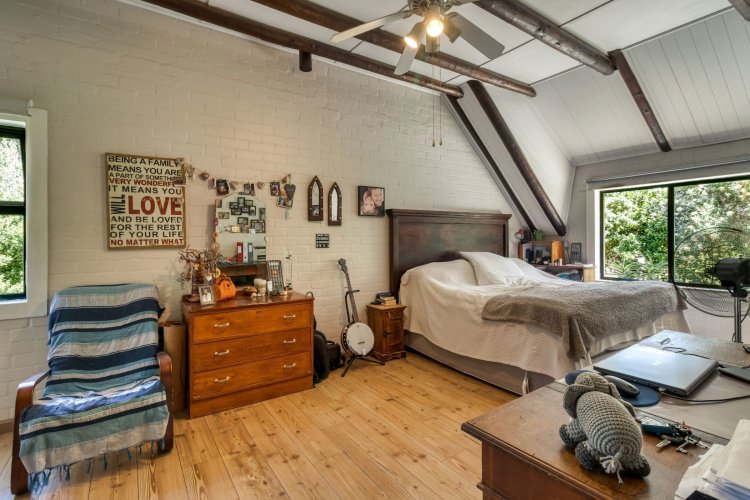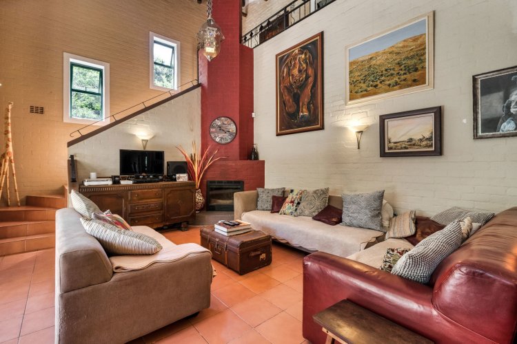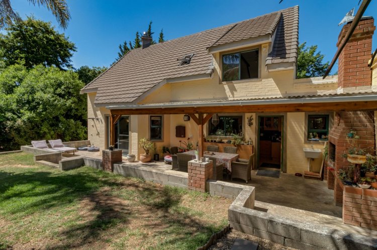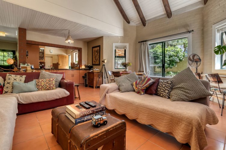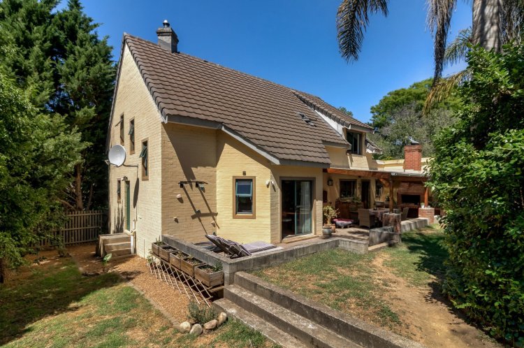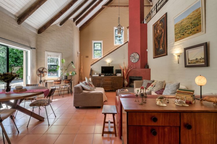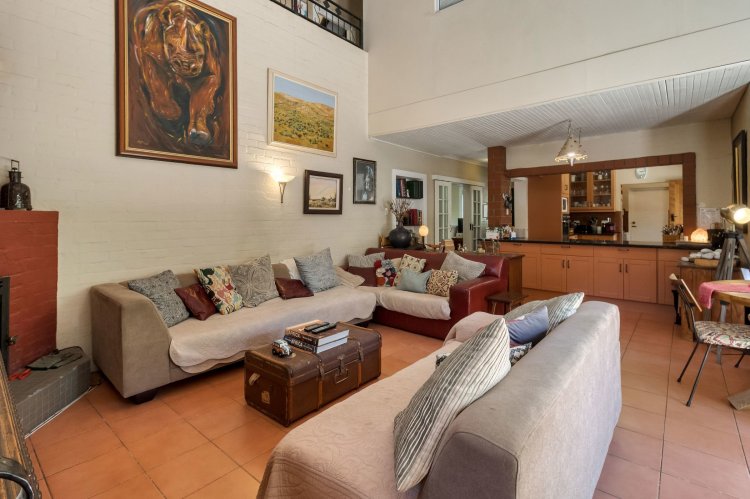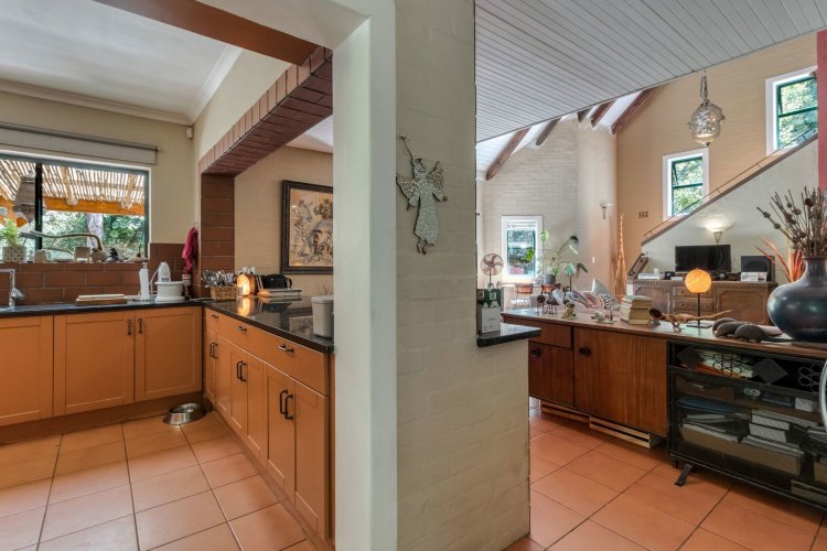 The home embraces warmth, character, and authentic charm throughout its generous spaces. A striking double-volume lounge and dining area features wooden ceiling beams and a fireplace. This space opens up to a covered veranda in the tranquil garden that surrounds the home. The open-plan kitchen flows seamlessly into the living area and offers extensive cupboard space and granite counters. The lower level includes one bedroom, perfect for guests and a bathroom.