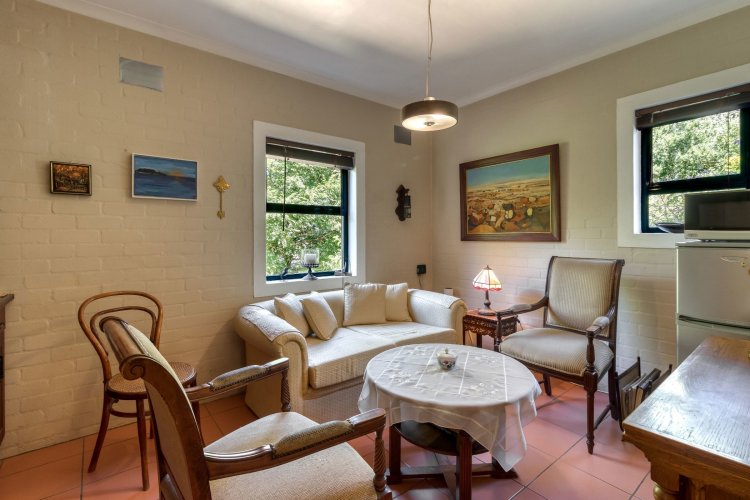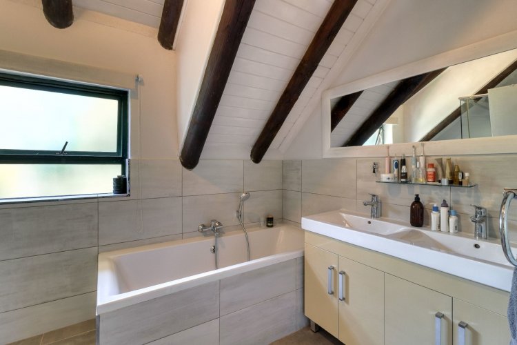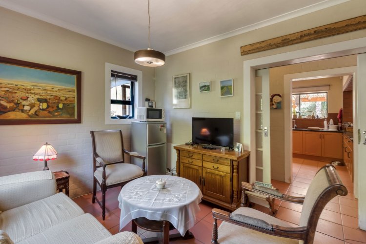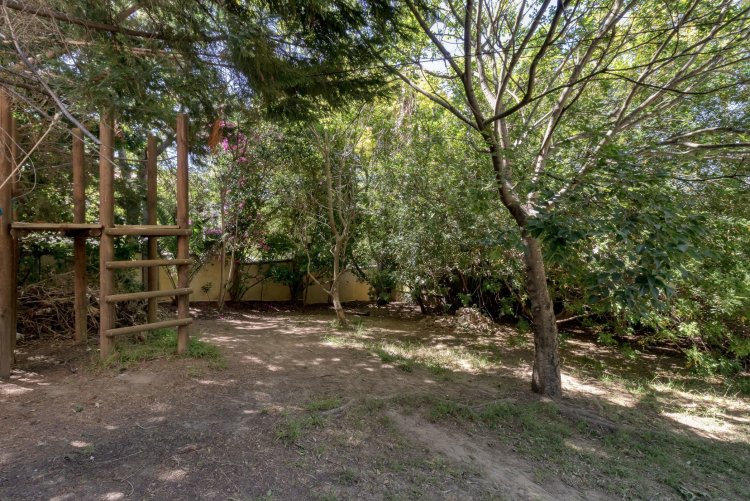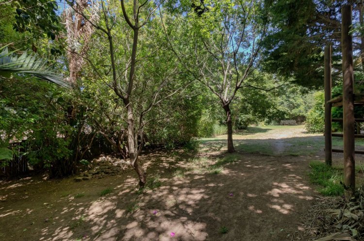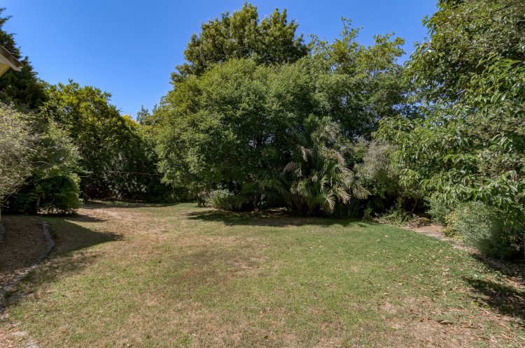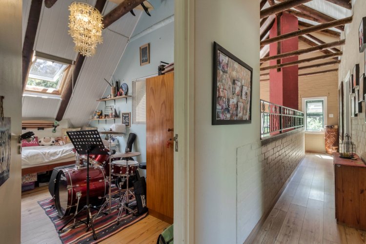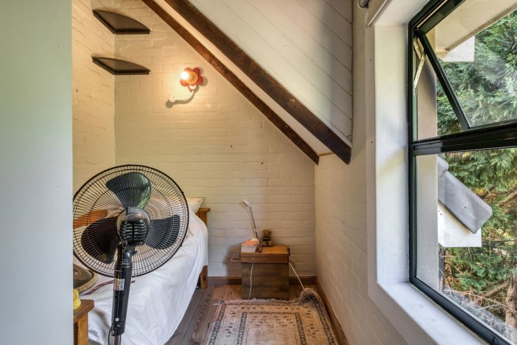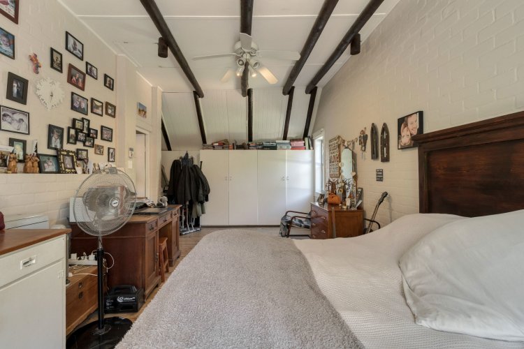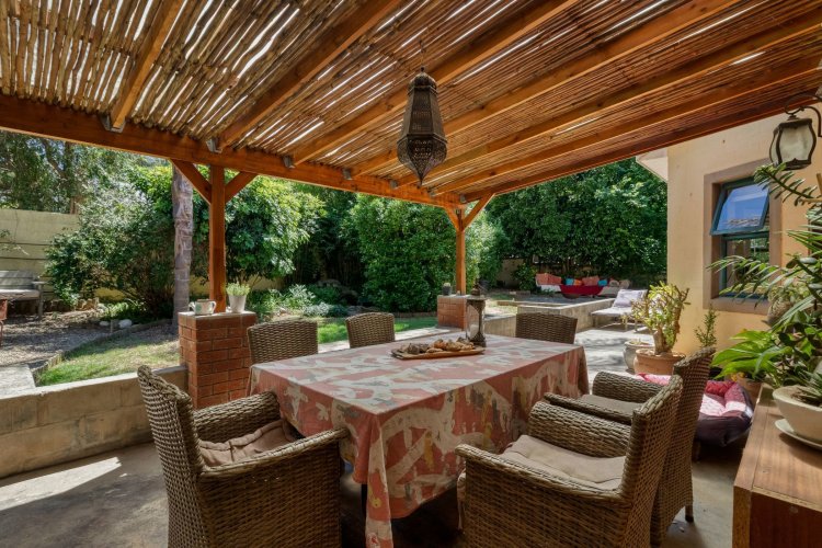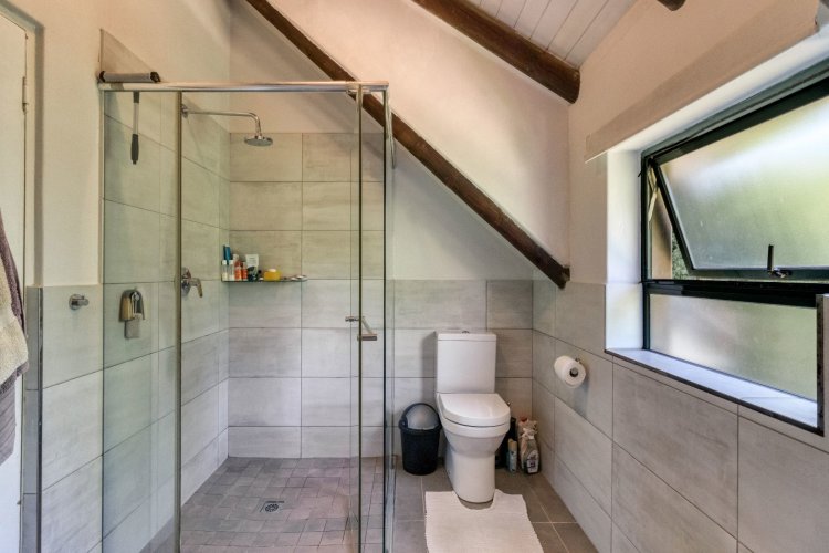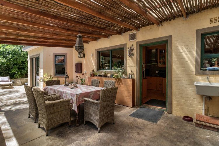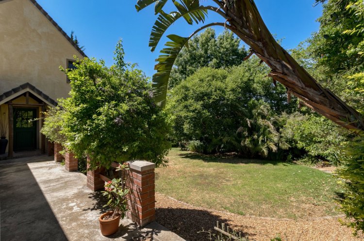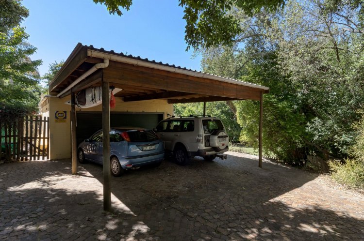 The home embraces warmth, character, and authentic charm throughout its generous spaces. A striking double-volume lounge and dining area features wooden ceiling beams and a fireplace. This space opens up to a covered veranda in the tranquil garden that surrounds the home. The open-plan kitchen flows seamlessly into the living area and offers extensive cupboard space and granite counters. The lower level includes one bedroom, perfect for guests and a bathroom.