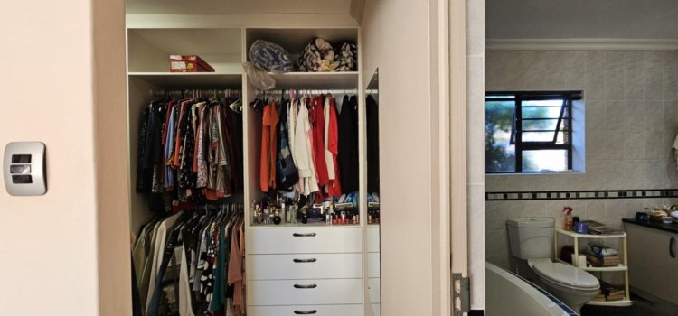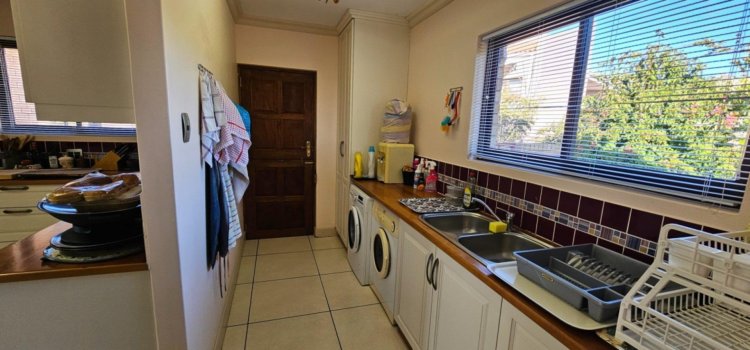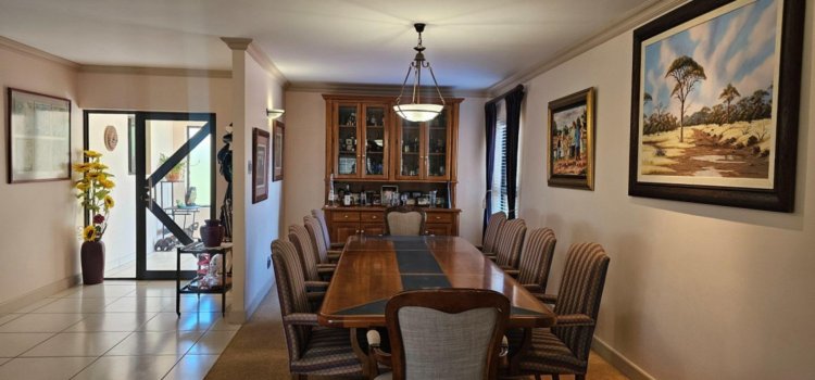 The open-plan living areas flow effortlessly between the lounge, dining, braai room, and kitchen, offering comfortable family living and easy entertaining. Stacking doors open from the braai room onto a covered patio and manicured garden, perfectly framing the views. An air conditioner in the lounge services the living spaces, ensuring year-round comfort.