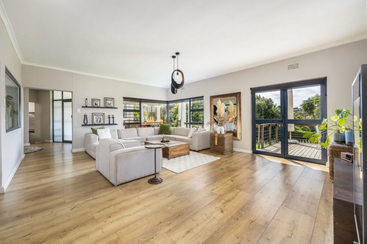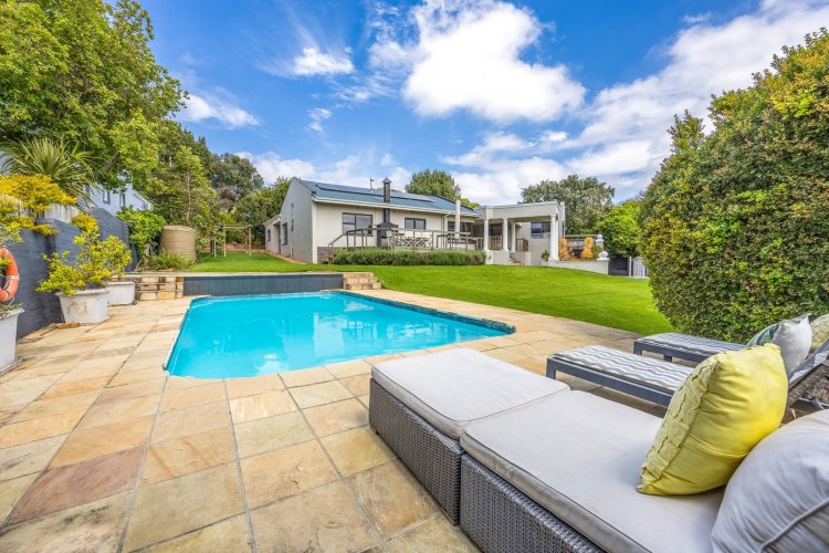 Being open plan to the dining room and spacious indoor braai room with it's patio beyond, it is ideal for entertaining. The TV lounge, to the right, with its wood burning stove and double doors open up onto the deck with its outside braai that overlooks the pool and garden.