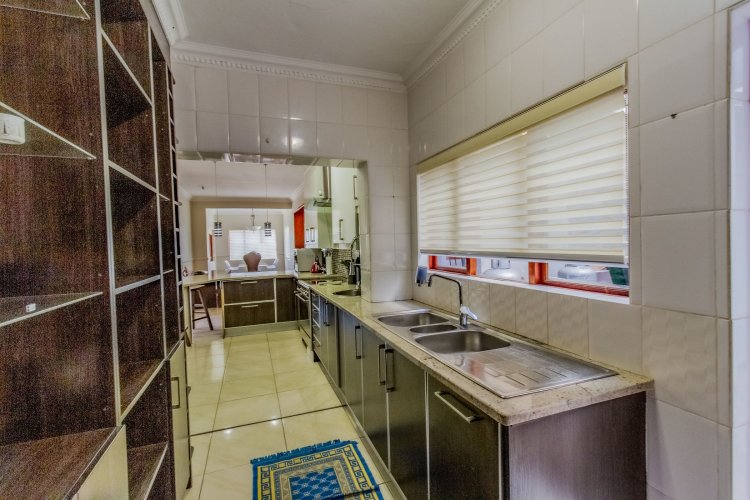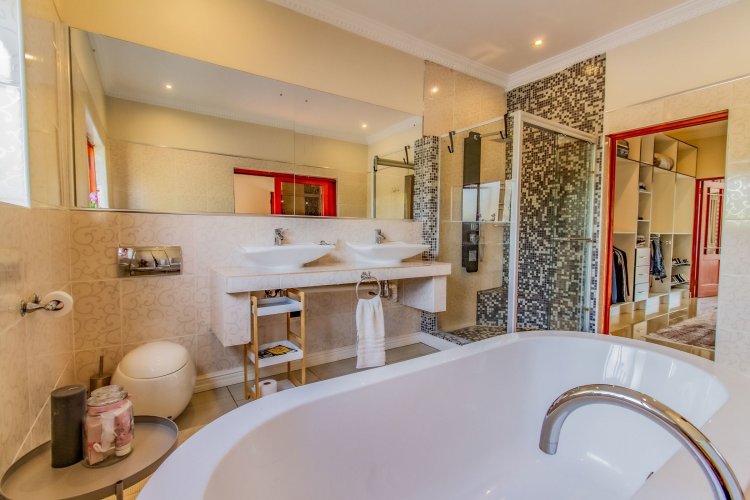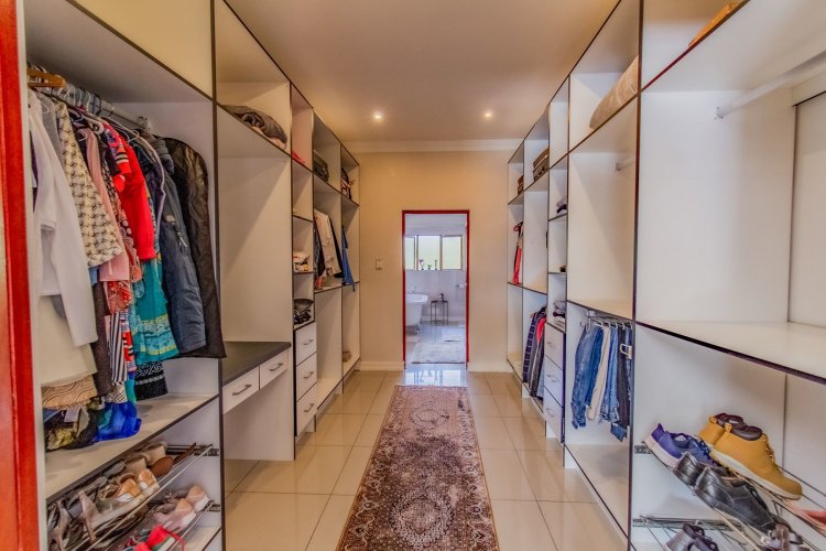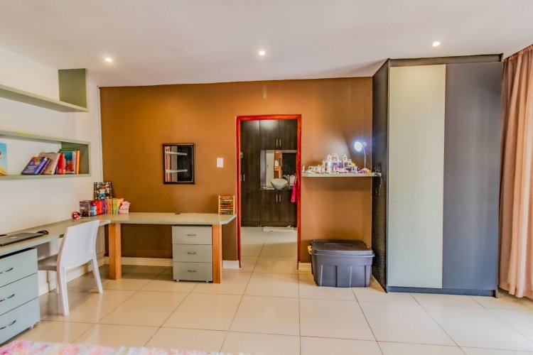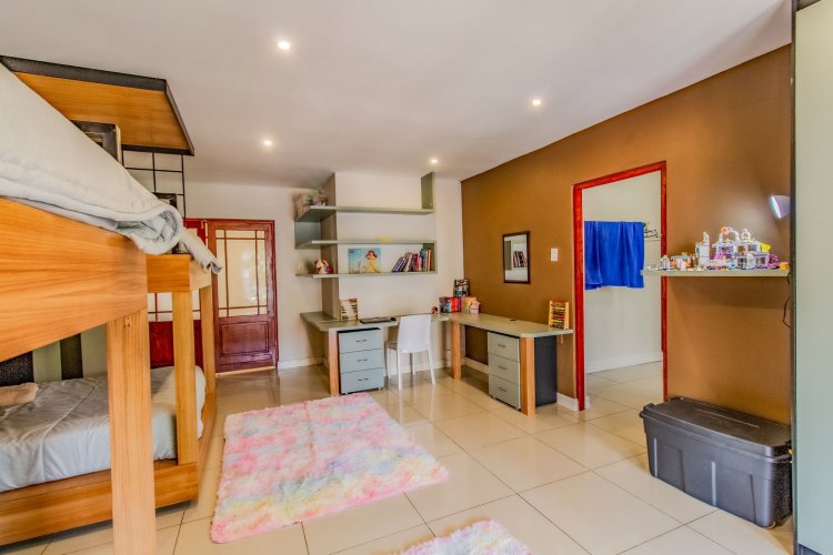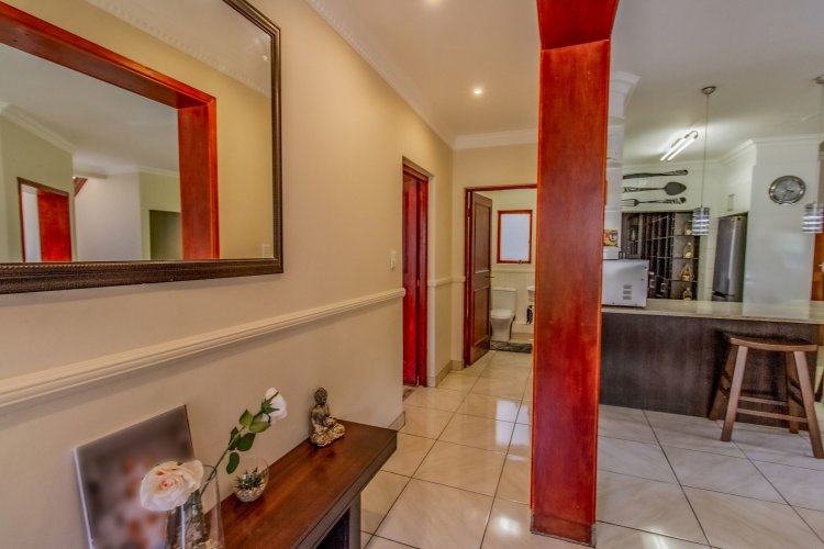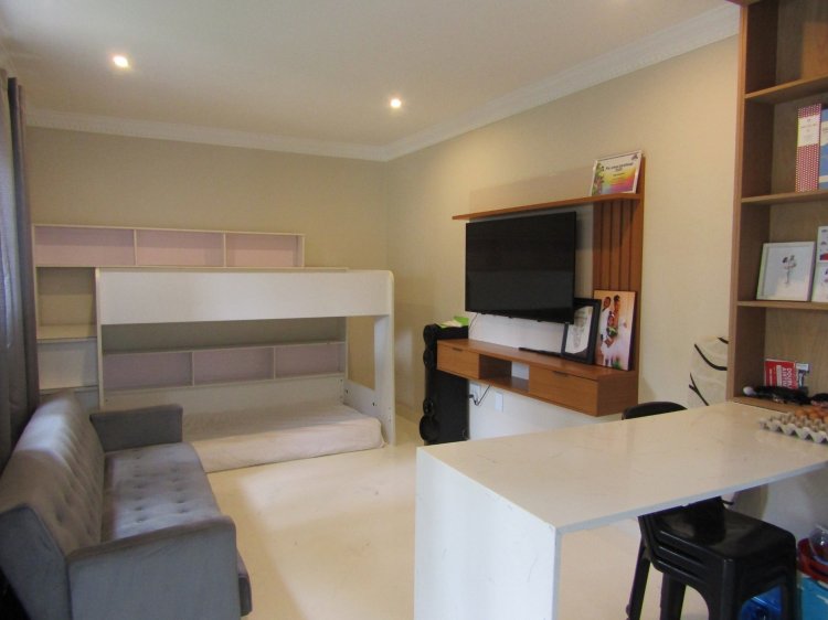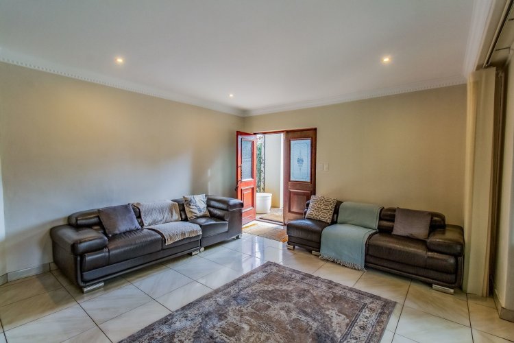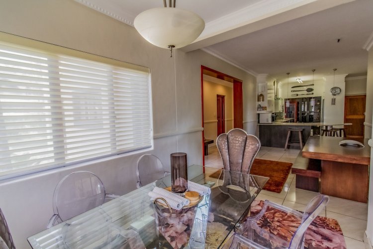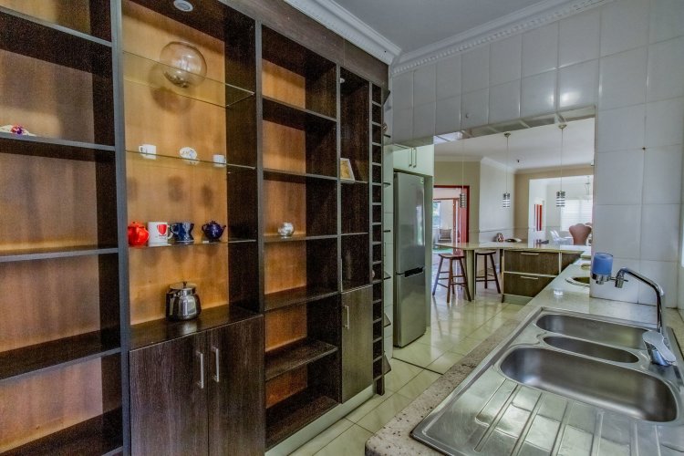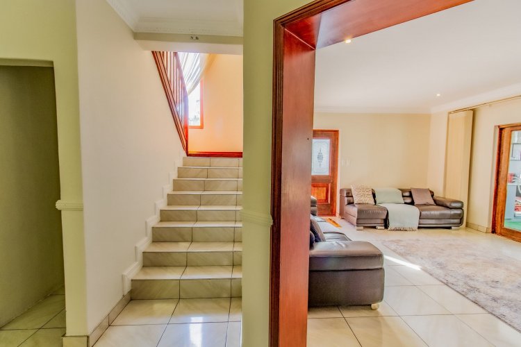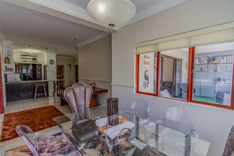Curtains are custom-made and are included in the sale. Furniture is available for purchase at a reasonable offer. The property is equipped with an 8kVA solar system, a water tank with pressure pump, a servant's quarter with en-suite bathroom, a double garage, and additional off-street parking.