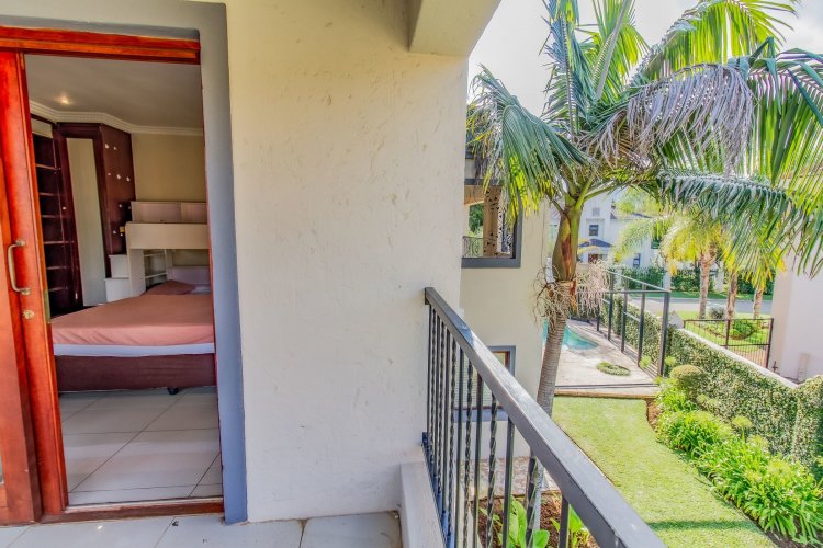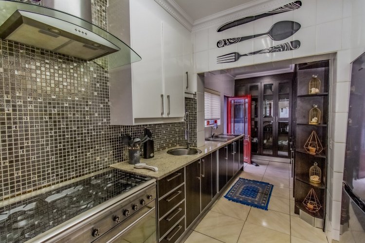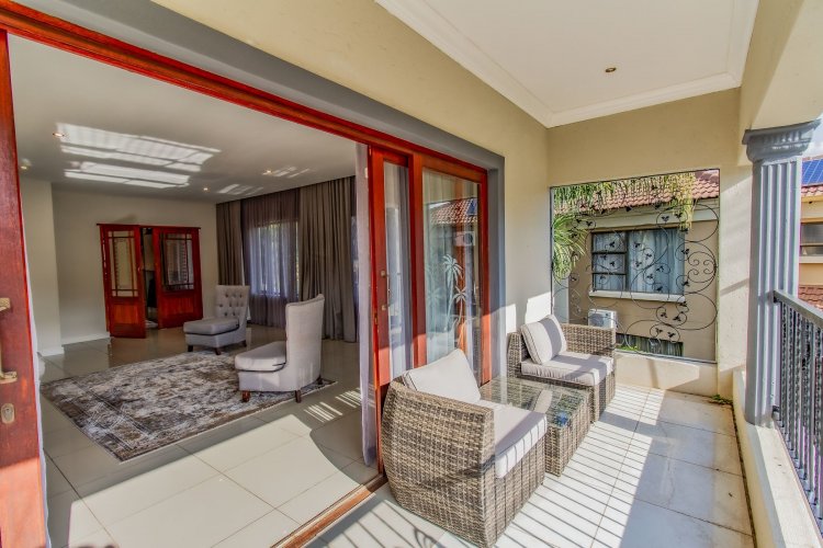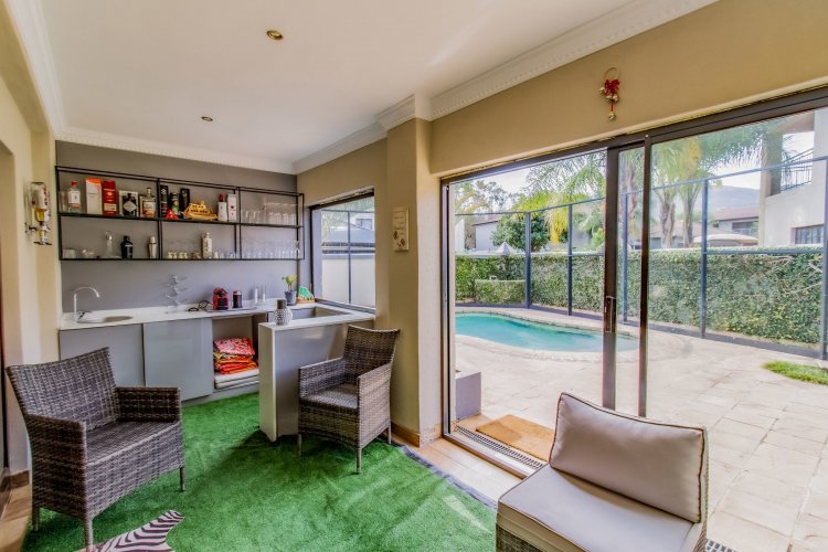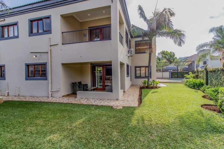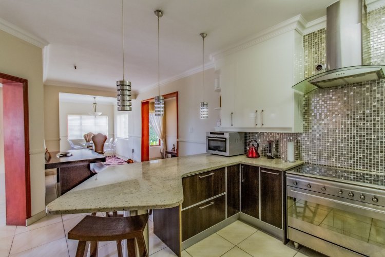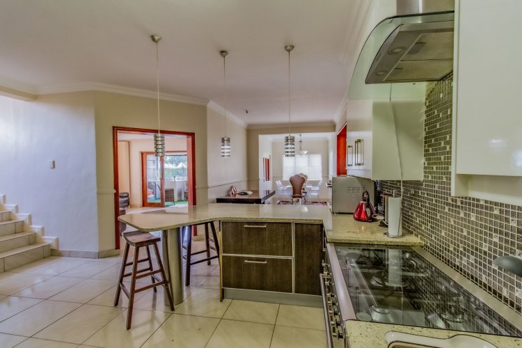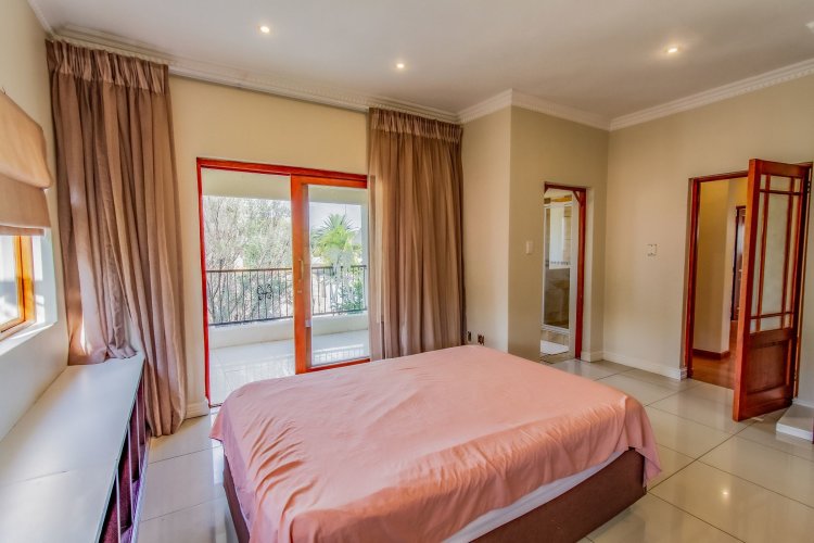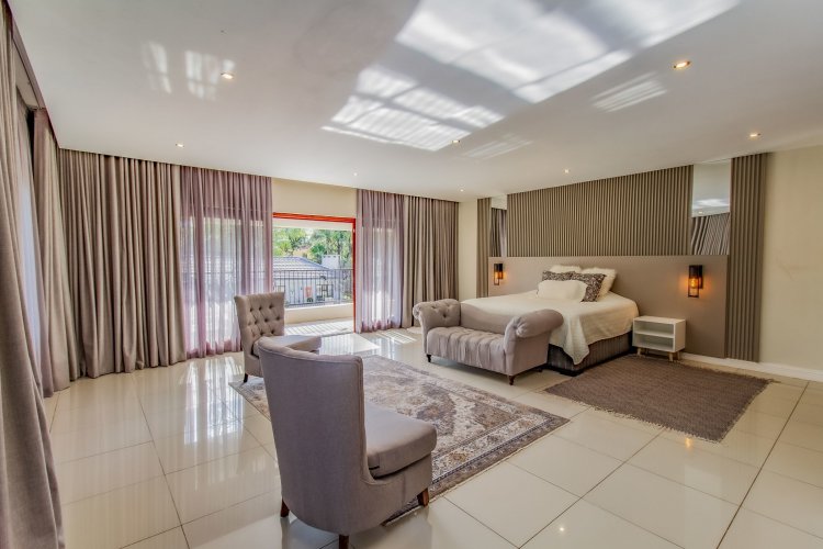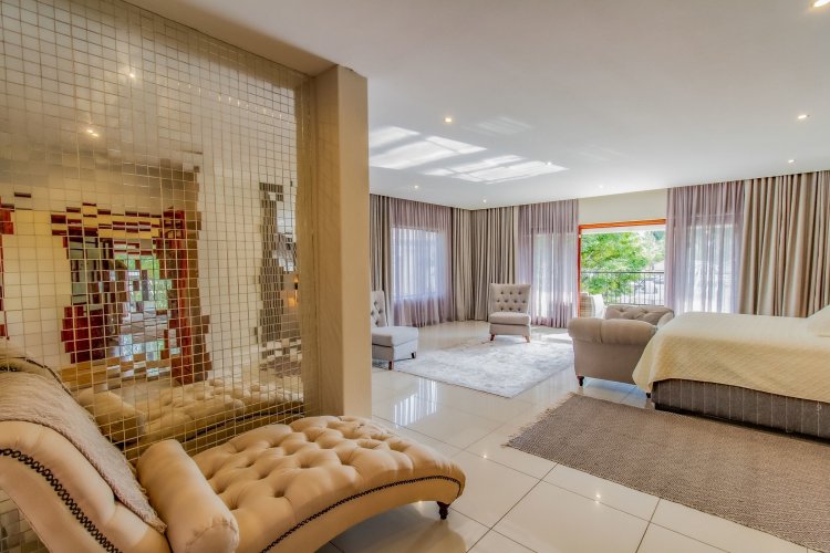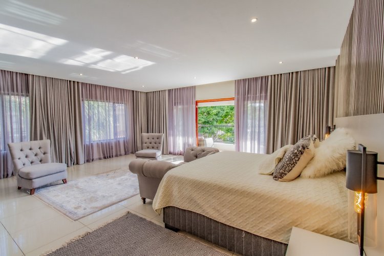 The property features a modern open-plan kitchen with a gas hob, a walk-in pantry, a scullery, dining room and living room that flows out to the family room and swimming pool. Four spacious and light bedrooms have balconies and bathrooms, all en-suite.