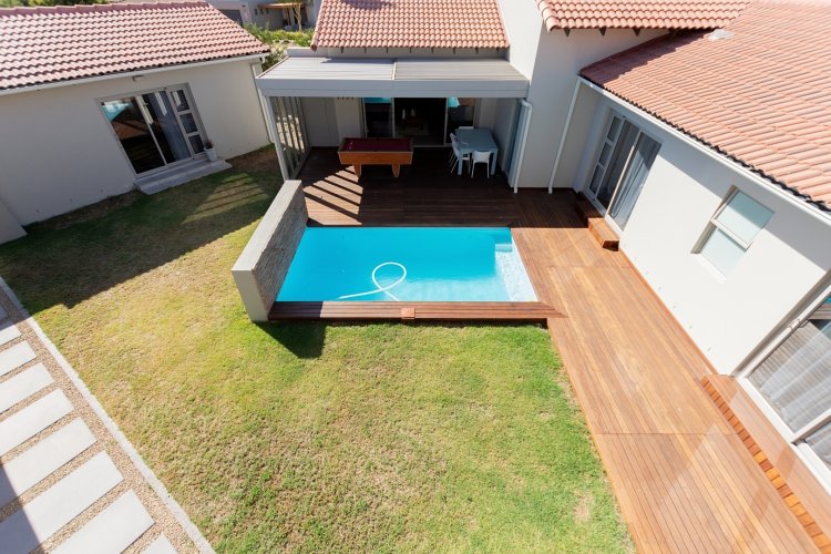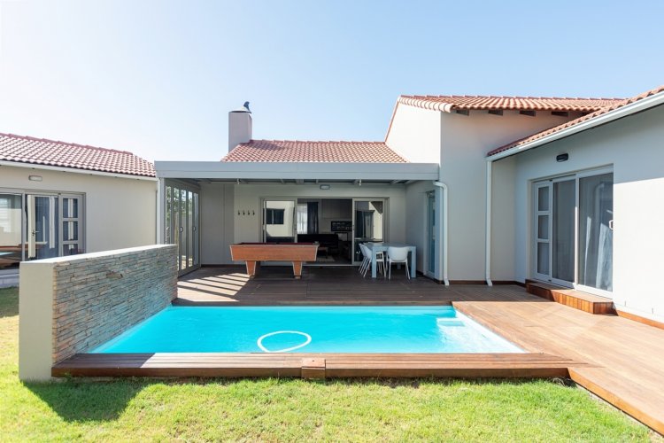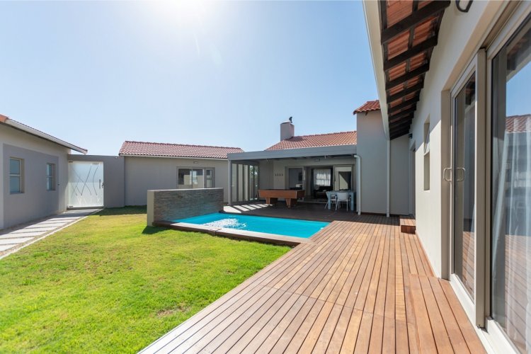 Exclusive Dual Mandate Positioned on a sought-after corner stand with access from two streets, this exceptional family home has been thoughtfully designed to offer privacy, space and flexible living for modern families and multi-generational households. Centred around a secluded internal courtyard, the home creates a private outdoor haven with a fibreglass heated swimming pool and timber deck, sheltered from surrounding neighbours and ideal for relaxed family living. This inward-facing layout ensures excellent privacy while allowing natural light and easy flow throughout the home. The ground floor offers superb versatility. Two well sized bedrooms are located in a separate wing, share a full family bathroom for guests or extended family members who prefer ground-level living. A private garden flat forms part of the courtyard layout, offering independence for mom and dad, visiting family or guests while remaining safely connected to the main residence. Entertaining is effortless and well-considered. A dedicated braai and entertainment room overlooks the pool and deck, creating a space where family members or guests can enjoy their own area without impacting the main living spaces. This makes the home ideal for both everyday living and hosting without compromise. The main living area is spacious and welcoming, combining a modern open-plan kitchen, dining area and lounge with excellent flow. Direct access from the extra-wide double garage through the scullery adds daily convenience and practicality. Upstairs, privacy continues. The passage offers a pajama lounge/home office/ bedroom and the master bedroom suite, with a balcony, walk-in cupboards with a dressing area, and en-suite bathroom offering a peaceful sense of separation from the rest of the home. Practical features further enhance the appeal. The corner position allows for generous paved driveways and parking for up to four vehicles. In addition to the double garage, a high-volume garage with extra-height automated doors comfortably accommodates a boat, caravan or larger vehicles, a rare and valuable asset within the estate. Key Lifestyle Benefits • Prime corner stand with dual street access • Exceptional privacy with an inward-facing courtyard design • Central pool and timber deck for family living and entertaining • Four bedrooms plus a private flatlet • Ideal for multi-generational living or extended family • Separate entertainment braai room with excellent flow • Extra-wide double garage plus high-volume boat or caravan garage • Flexible layout allowing independence and togetherness Specialised Alustation doors and window glass reduce fading / colour changes caused by sun damage over time. • 24 hour response Security Estate Living within Langebaan Country Estate Golf course, clubhouse, restaurant and pub, tennis, padel, netball, fitness gym, spa, bowls, coffee shop, walking, cycling and walking paths, and close to shopping centres, PVT schools, Lagoon and water sports and restaurants. This is a home designed to adapt to family life over time, offering space, privacy and flexibility in one of Langebaan Country Estate’s most convenient and desirable positions. For a personal introduction and private viewing, please contact Robin-Leanne, your specialist property practitioner in Langebaan Country Estate.