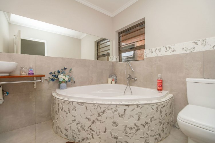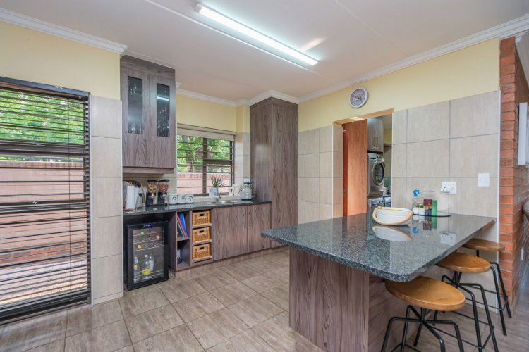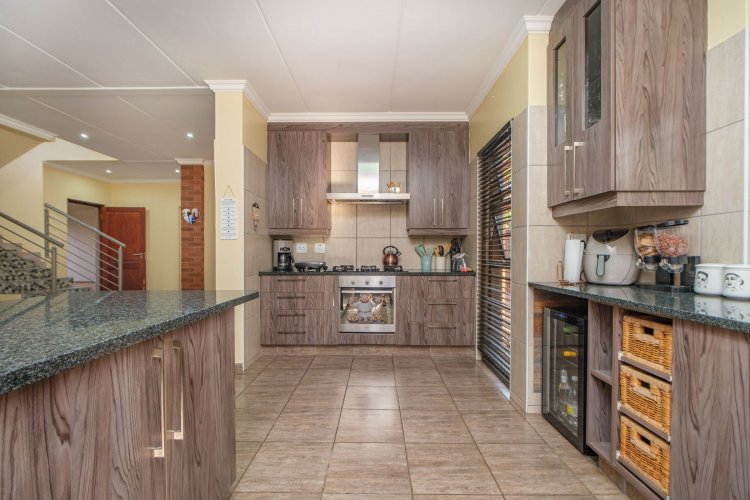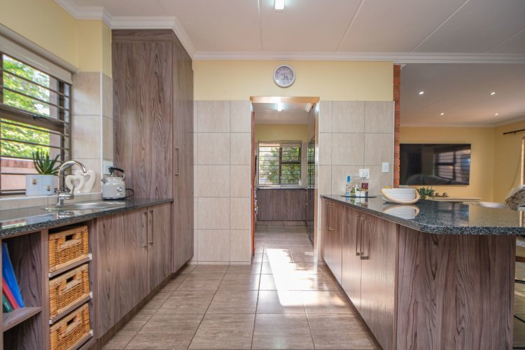 Step into the open-plan layout that flows seamlessly into a modern, well-appointed kitchen, featuring a breakfast nook for family mornings, a separate scullery, gas hob, built-in oven, and ample cupboard space throughout. There's room for all your appliances, including a double-door fridge, and a convenient back door leading to the garden adds to the home's practicality.