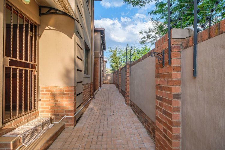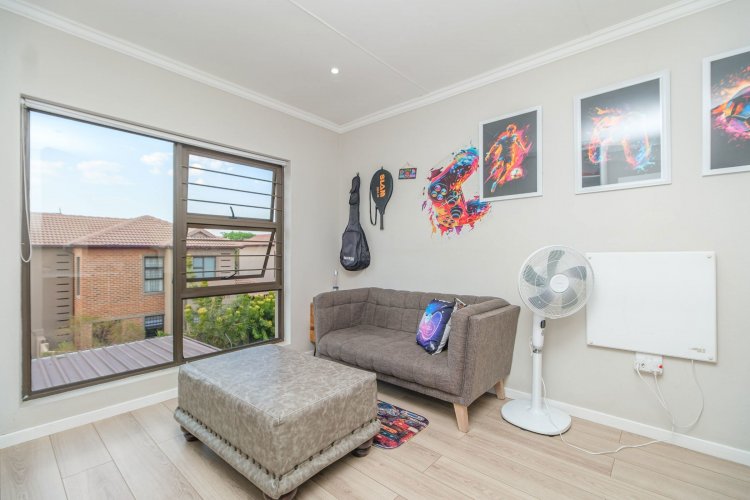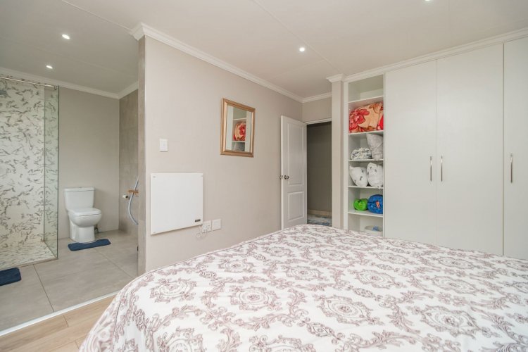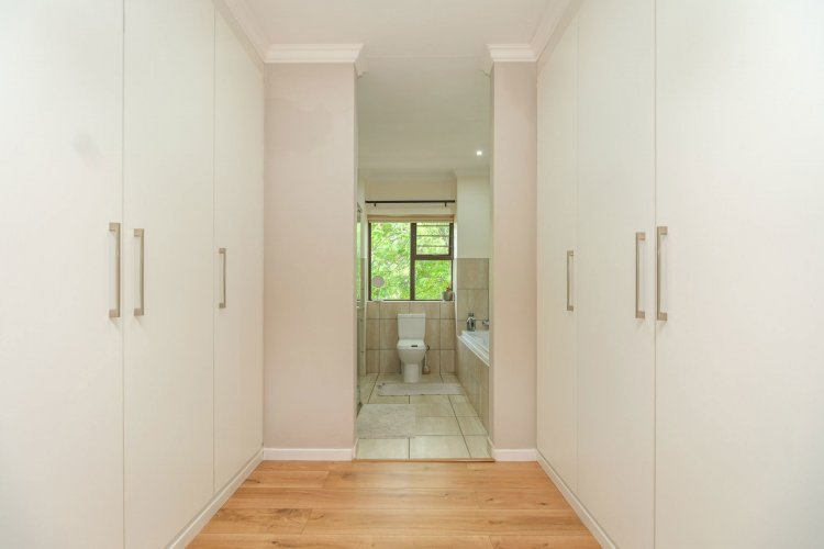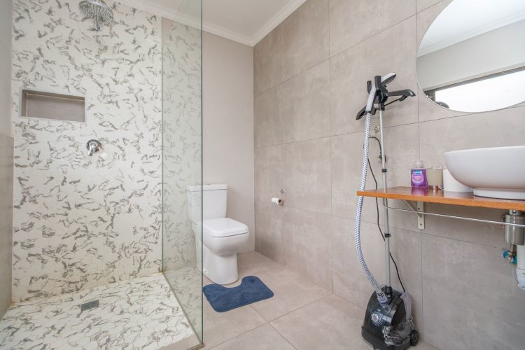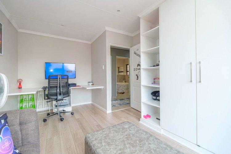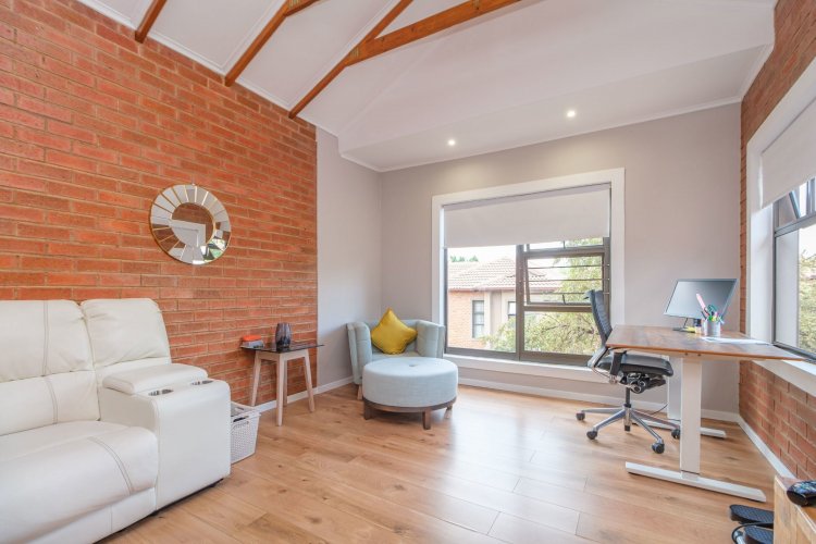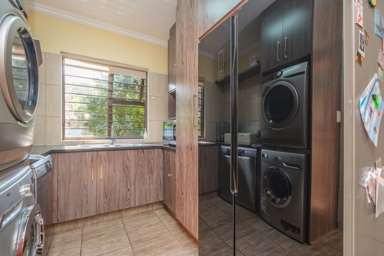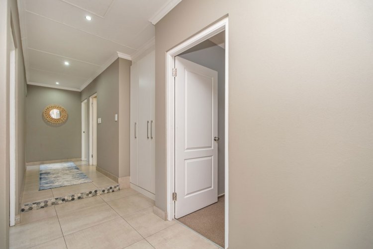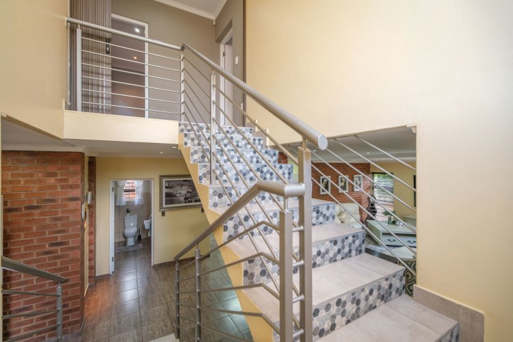 Under the staircase, you'll find an impressive built-in wine display, adding a touch of luxury to the home's ambiance. The home is tiled throughout and includes a linen cupboard for added convenience. The beautifully landscaped garden offers ample space for children and pets to play, all within the security and serenity of Ruimsig Country Estate — providing peace of mind and a truly exceptional lifestyle.