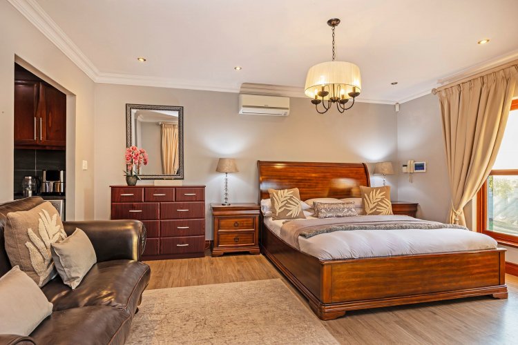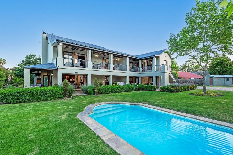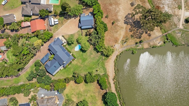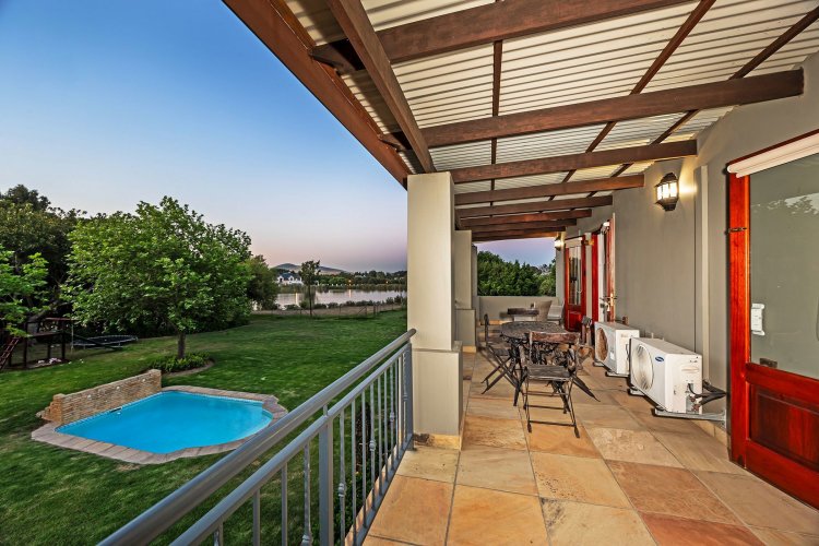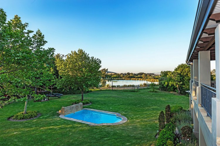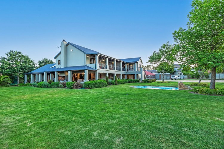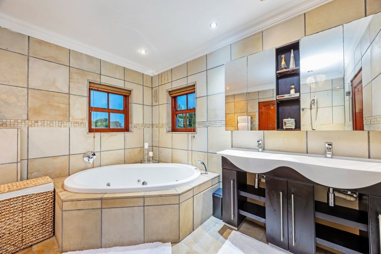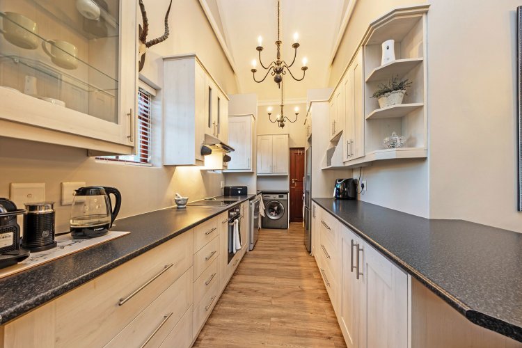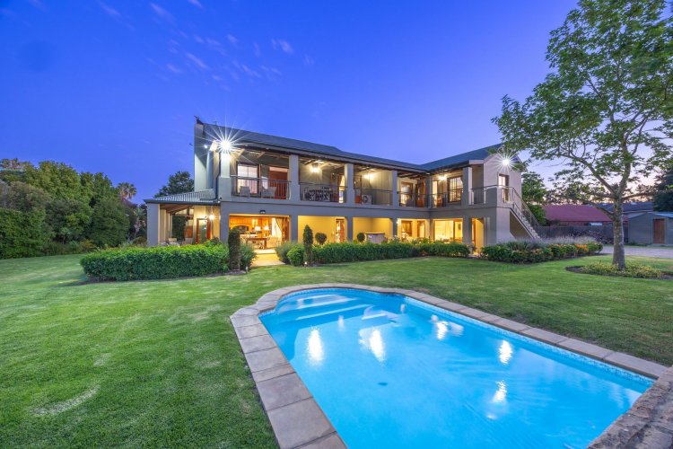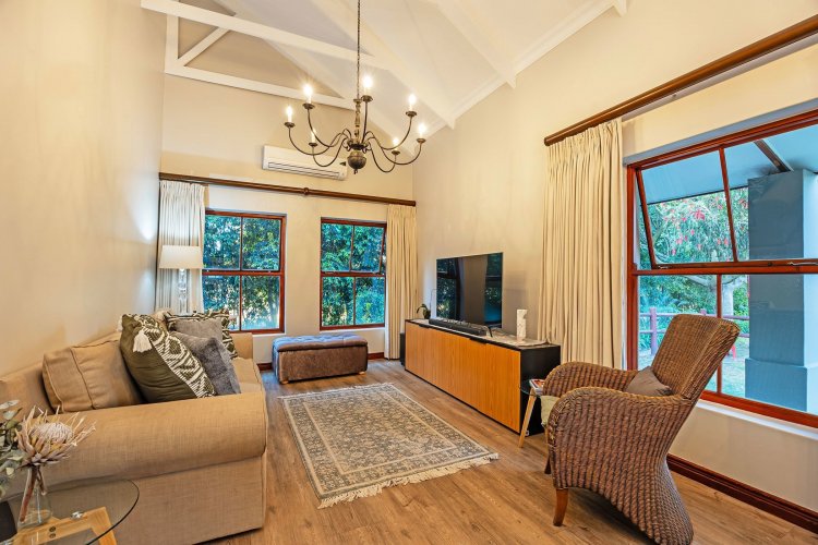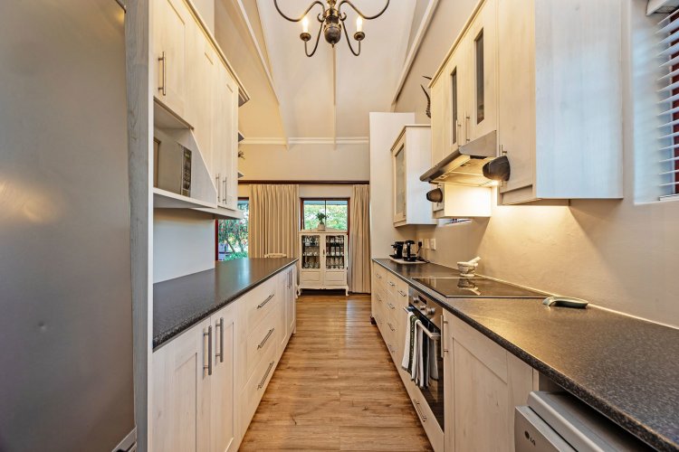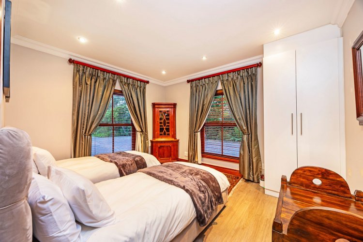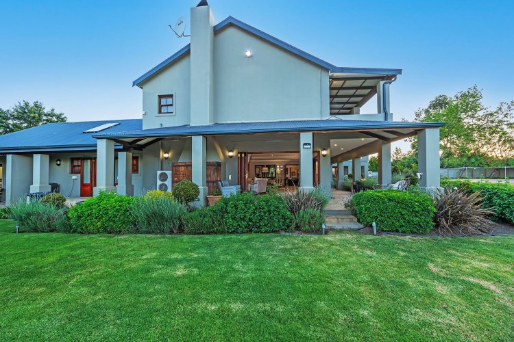 Bathed in natural light, this generously proportioned home offers a double volume entrance hall, three open plan living areas with contemporary indoor braai/fireplace and stunning gourmet solid cherry wood kitchen with Rustenburg granite tops – all opening seamlessly onto the landscaped well-maintained garden and covered patio. A private guest suite also to be found on the ground floor adjacent to an eye-catching staircase that leads up to a spacious pajama lounge with double door leading to a wraparound large patio and overlooking this stunning garden with views on the Vierlanden dam and mountains. The master suite is luxurious with a coffee station, full en-suite with spa bath and double basin. Also opening up to the covered patio overlooking the lovely garden and dam. There is another double bedroom on this level, sharing a bathroom. Reflecting a style that is both functional and sophisticated this home has its own security cameras, alarm, beams and day/night outside lights. Other notable extras include the highest quality fixtures and fittings throughout, bespoke cabinetry, high ceilings, vinyl flooring, sand stone tiles, ceiling fans, heated towel rails, borehole, water tank, irrigation, air cons, fibre swimming pool and under covered parking for 4 vehicles. Besides the stunning main house, there is a second dwelling with 2 bedrooms, lovely open plan living area with exposed beams opening up to large covered patio overlooking the luscious garden. Th 2nd dwelling has its own carport. Perfect to work from home or for a granny. The ultimate bonus is the three self-contained flatlets with each with their own bathroom and kitchen, as well as pre-paid electricity meters and alarms. This lovely property does not only offer tranquilness, but also an income generation business of just shy of close to R40 000 per month. However, to convert the flatlets back to the main house is easily possible. A must to view this once in a life time opportunity, close to all amenities, schools, hospital and trails.