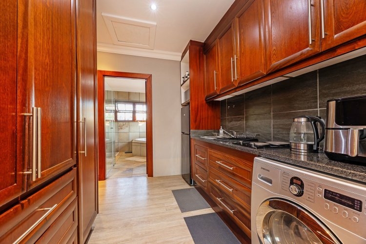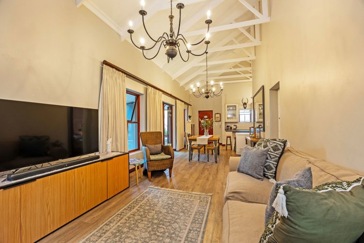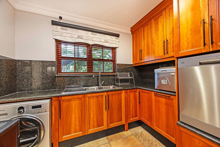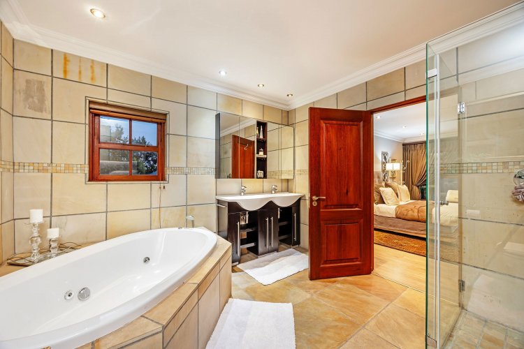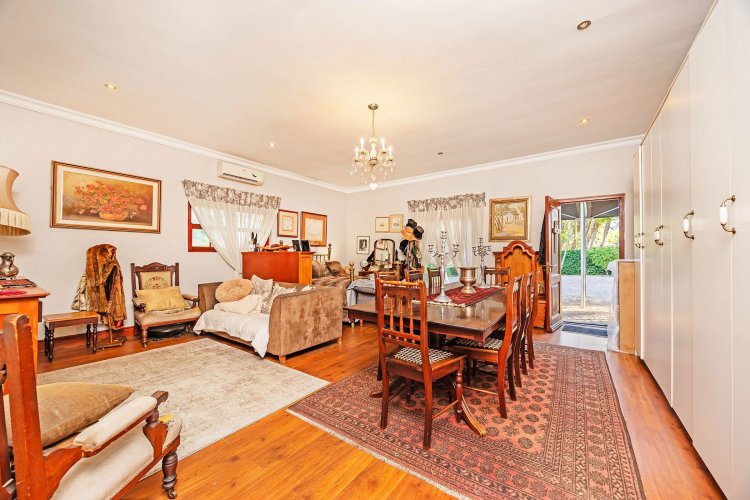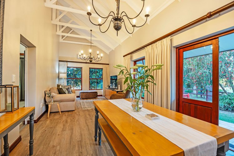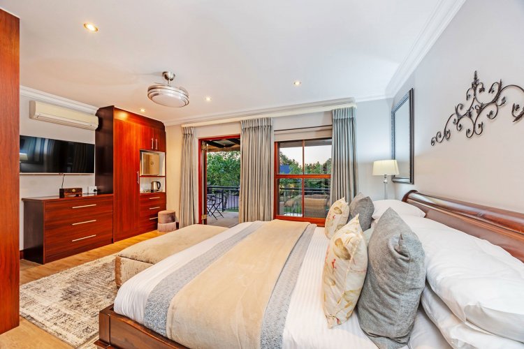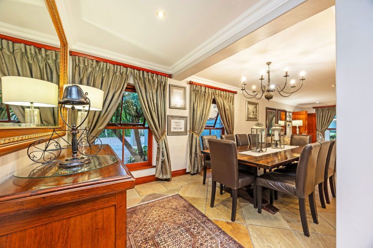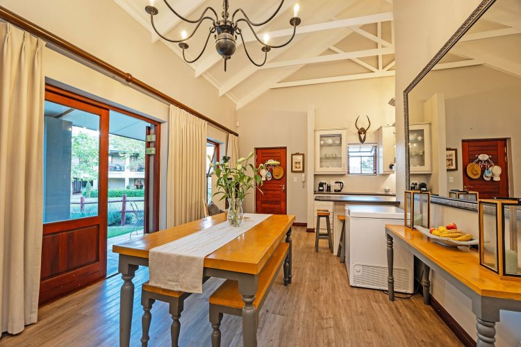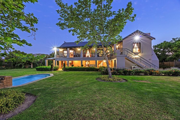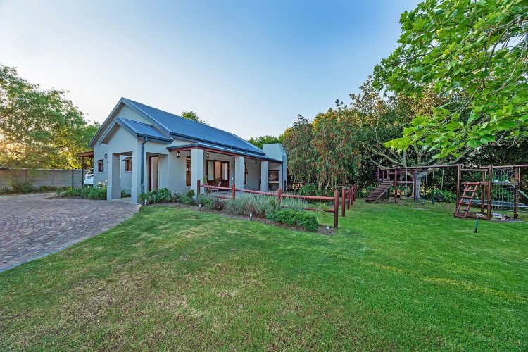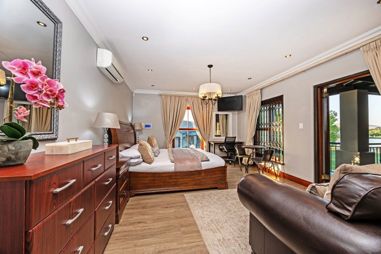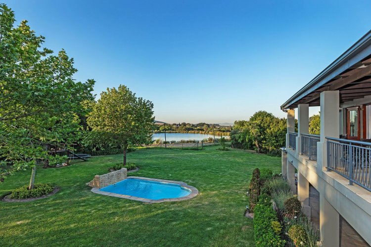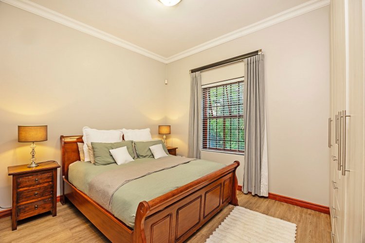 Bathed in natural light, this generously proportioned home offers a double volume entrance hall, three open plan living areas with contemporary indoor braai/fireplace and stunning gourmet solid cherry wood kitchen with Rustenburg granite tops – all opening seamlessly onto the landscaped well-maintained garden and covered patio. A private guest suite also to be found on the ground floor adjacent to an eye-catching staircase that leads up to a spacious pajama lounge with double door leading to a wraparound large patio and overlooking this stunning garden with views on the Vierlanden dam and mountains. The master suite is luxurious with a coffee station, full en-suite with spa bath and double basin. Also opening up to the covered patio overlooking the lovely garden and dam. There is another double bedroom on this level, sharing a bathroom. Reflecting a style that is both functional and sophisticated this home has its own security cameras, alarm, beams and day/night outside lights. Other notable extras include the highest quality fixtures and fittings throughout, bespoke cabinetry, high ceilings, vinyl flooring, sand stone tiles, ceiling fans, heated towel rails, borehole, water tank, irrigation, air cons, fibre swimming pool and under covered parking for 4 vehicles. Besides the stunning main house, there is a second dwelling with 2 bedrooms, lovely open plan living area with exposed beams opening up to large covered patio overlooking the luscious garden. Th 2nd dwelling has its own carport. Perfect to work from home or for a granny. The ultimate bonus is the three self-contained flatlets with each with their own bathroom and kitchen, as well as pre-paid electricity meters and alarms. This lovely property does not only offer tranquilness, but also an income generation business of just shy of close to R40 000 per month. However, to convert the flatlets back to the main house is easily possible. A must to view this once in a life time opportunity, close to all amenities, schools, hospital and trails.